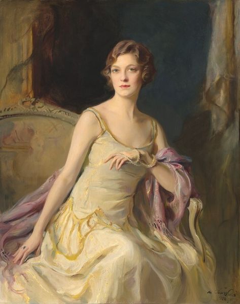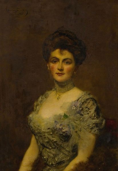 Curator: Sargent painted "Ellen Sears Amory Anderson Curtis" in 1903. Oil on canvas, isn't it lovely? What are your initial thoughts? Editor: Serene. And yet, a little melancholy. She’s ethereally beautiful, of course, but her gaze... there's something quite solemn there. Almost a vulnerability beneath the societal expectation. Curator: Absolutely, the turn of the century saw these commissioned portraits as visual records of status, often sanitizing real emotions to fit an idealized version of the sitter. Ellen Curtis was part of a prominent Boston family. Editor: Ah, that context is key. You can almost hear the whispers about "Boston Brahmins." The social expectations! Did she have a say in how Sargent portrayed her, do you think? Was it collaborative or... more directed? Curator: That's the tantalizing question, isn't it? Sargent was celebrated, he likely had a lot of influence, and would likely have dictated the overall look. Look at how he’s captured the shimmering light on her gown, the delicate brushwork... he’s showing off his skill, emphasizing elegance, while perhaps smoothing over complexities of the person. Editor: The dress itself is a performance, isn’t it? Pale colours, draped so carefully, meant to display wealth. A soft cage to trap emotions. Her turquoise necklace stands out vividly against the gown, and pulls us directly into her eye line. Curator: Exactly, it's strategically positioned! It echoes the small adornment in her hair, and the slight splash of turquoise on her shoulders. Those echoes bind the elements, a visual anchor, subtly directing where our eyes are drawn. She is indeed put on display, the accoutrements all serving to convey a certain societal place and importance. Editor: Knowing what we do now about the constrained role of women at the time, and her elevated social positioning makes one wonder what her lived experience was really like? Perhaps some deep unspoken sadness, or silent struggles behind that poise. Curator: Beautifully put. Sargent gives us this beautiful façade, which on the one hand perpetuates that idealized version of women, and on the other hand allows us to wonder what untold story exists beneath. Editor: It leaves me wanting to paint *my* version, to peel away those layers of presentation and discover the raw, unvarnished self. I wonder what she would think about our pondering over this painting today! Curator: That’s what makes this such a fascinating conversation piece! She speaks to us across time, inviting endless interpretation.
