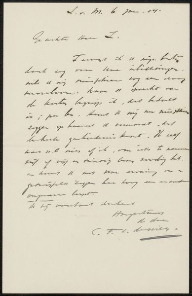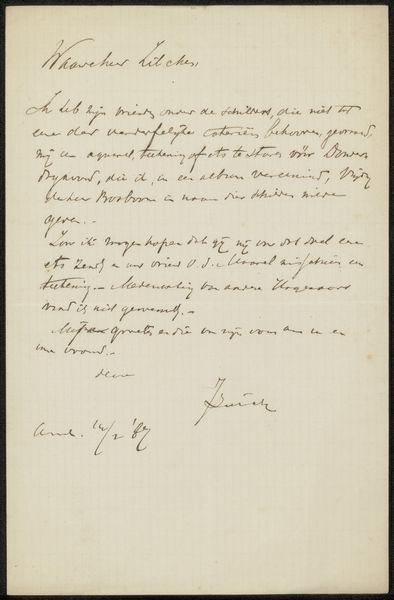 Curator: Well, if this isn't intriguing: it’s a letter by Jacobus Ludovicus Cornet titled "Brief aan Jan Weissenbruch," likely dating from around 1854 to 1857. Currently, it resides at the Rijksmuseum. Editor: You know, immediately, I’m struck by the quiet intensity of the handwriting. The looping, dark ink feels almost like a spider's web on this aged paper. There's an intimacy that the words can't even touch. Curator: Yes, and what’s really interesting to me is that it provides a glimpse into the social circles of artists during the Dutch Golden Age revival. This letter, pen and ink on paper, is addressed to Jan Weissenbruch, who was also a prominent artist. Think of it as a kind of art-world LinkedIn update of its day. Editor: A very formal LinkedIn update, from the look of things! I imagine them puffing away on pipes, exchanging serious thoughts on perspective, composition—that sort of thing. It all seems very considered, with no space for improvisation. Curator: Perhaps! Letters like this played a crucial role in establishing artistic networks. Exhibitions were just getting going, so these personal contacts were everything for patronage and reputation. Think how many galleries there are these days; imagine relying on personal contact alone. Editor: You're right, it’s wild! But, seeing this now, as this beautifully preserved fragment, it strikes me less as commerce and more like an intimate conversation across time. I can't help but wonder about the friendship between Cornet and Weissenbruch, and if, maybe, beneath all that formality, there were moments of shared laughter and artistic inspiration. Curator: I hadn't thought of the humor, but I take your point! This makes me think of these artifacts less as records of facts and more as echoing traces of conversations across the ages, both important and banal. Editor: It does make you think of what fragments of your digital communication could make their way to a museum two centuries from now. Anyway, that dark script still resonates... what thoughts this inspired in them, now echoed across the void.