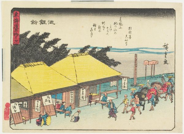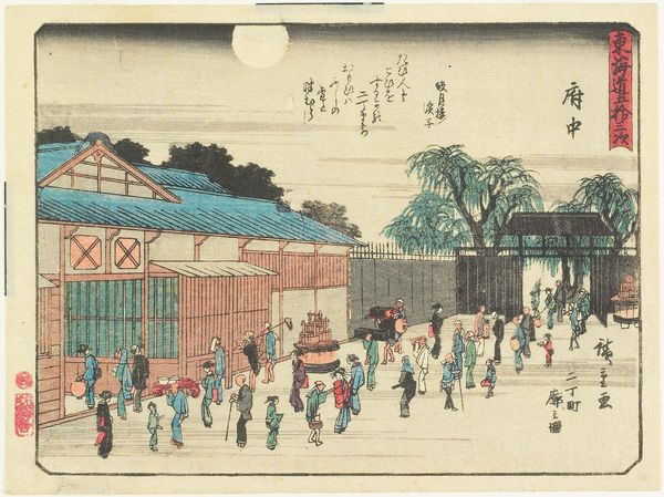 Curator: Let's explore this print, “Narumi,” by Utagawa Hiroshige, created around 1840 to 1842. It’s a woodblock print in the ukiyo-e tradition, currently residing here at the Minneapolis Institute of Art. Editor: It has an intriguing feel—melancholic maybe? The cool blues of the buildings contrast so starkly with that warm, almost fiery sunset. I wonder about the physical process of carving all those lines… Curator: The interesting play of color and contrast reflects, perhaps, a deeper truth of 19th-century Japan, a society in transition. Consider the figures, common travelers. Hiroshige portrays them within the established societal hierarchies, even as the rising merchant class started gaining prominence. Their travel was often prescribed by class and trade. Editor: You see the rigid social structure, but I’m drawn to the laborers. The very act of carving each block would be so incredibly precise; each figure represents the countless artisans working to produce prints like this. Ukiyo-e wasn't just “art,” but rather commercial objects. And this example feels more down to earth, in contrast with the romantic depictions of courtesans, don’t you think? Curator: True, but even depictions of common people are stylized here to embody aesthetic ideals linked to gender and class, such as refinement and submission, depending on whether the individual is male or female. We can’t detach such concepts from understanding the representation of laborers and the broader implications embedded within it. The aesthetic doesn't erase those critical elements, in my opinion. Editor: I concede. We could endlessly debate whether form dictates social implications. But what's undeniable is the mastery displayed. Think of the different artisans—from block cutters to printers, each carefully imprinting the image and adding layers of meaning through the selection of color! Even the type of paper utilized would make the final expression ever so subtle. Curator: Yes, seeing how art reflects socio-economic conditions deepens my appreciation. The image invites dialogue, questioning norms of gender, race and identity in Edo-period Japan. Editor: Indeed. And seeing all that painstaking labor and all the many workers' involvement puts everything into an entirely different perspective for me, bringing us from art history to a labor dispute... food for thought, for sure!
