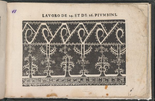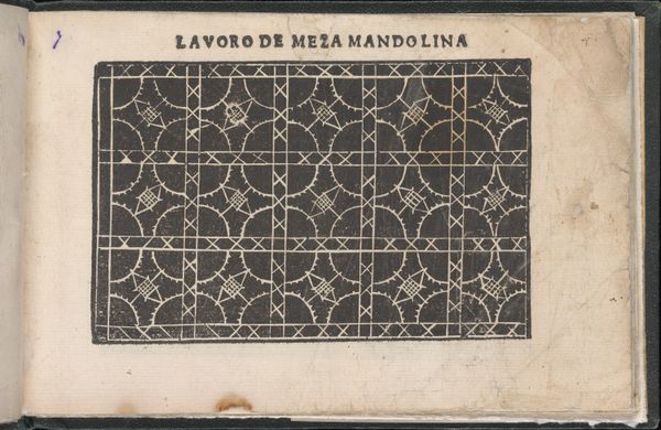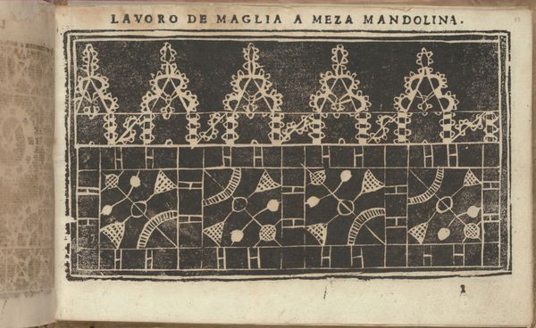 Editor: This is a page from "Studio delle virtuose Dame," created in 1597 by Isabella Catanea Parasole. It's an etching, and it looks like a pattern design, almost architectural in its rigid geometry. What strikes me most is the contrast between the solid dark shapes and the precisely rendered lines. What do you see in this piece? Curator: I see a potent example of the complex role pattern books played in shaping early modern visual culture. Works like this, particularly those created by women artists like Parasole, offered a means of both creative expression and economic independence. Considering the rigid social structures of the time, how might this book have empowered women? Editor: That's a great question. Could it have provided access to trades or artistic practices typically reserved for men? Curator: Exactly! The “virtuous lady” was increasingly expected to possess certain artistic skills. Pattern books like this allowed women to engage with the expanding world of commerce through lacemaking and embroidery, turning domestic crafts into viable economic activities. Do you see the political implications in controlling and disseminating this type of imagery? Editor: I think so. By creating and publishing these designs, Parasole challenged traditional artistic hierarchies and provided a template for other women to do the same, disrupting the established art world to some extent? Curator: Precisely! And remember, access to visual information was carefully controlled at this time. Printing allowed for the wider dissemination of artistic ideas, shifting power away from the traditional guilds and aristocratic patrons. Editor: That's fascinating. It’s amazing to consider the subtle power dynamics at play in something that seems purely decorative on the surface. Curator: It’s a good reminder that art doesn’t exist in a vacuum, but is deeply embedded in the social and political landscape. I see now a confluence of commerce, social expectation, and subversion in the Italian Renaissance through Parasole's work.