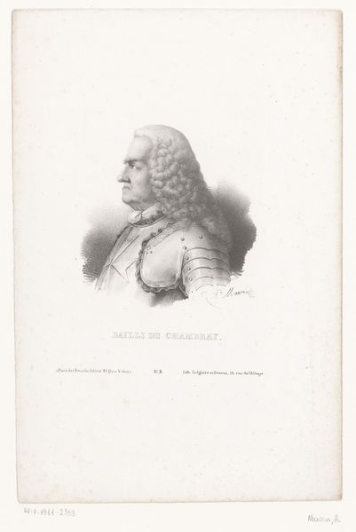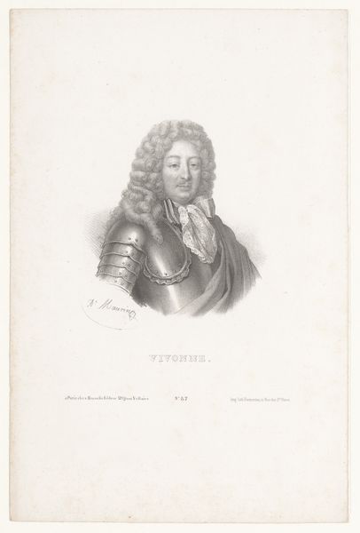 Curator: Here we have a portrait of François Louis Rousselet, Marquis of Châteaurenault. It's an 1836 print by Antoine Maurin, rendered in graphite. It belongs to the neo-classicist style, but also demonstrates the strong influence of Academic Art in the period. Editor: My first impression is one of controlled power. There’s a definite stillness to the portrait, a sense of dignity that verges on coldness. That tight rendering in graphite really emphasizes that. Curator: Absolutely. Considering the socio-political climate of 19th-century France, it's important to examine who gets memorialized in art. The Marquis held a position of considerable influence during his lifetime; this image helped shape and perpetuate it for future generations. Editor: And that position, in turn, was defined by class, gender, and power dynamics within the aristocracy. The Marquis’s gaze, though subtle, speaks volumes about authority. The armor, although it looks more like costume than actual battle armor, makes the portrait feel overtly masculine, further cementing those traditional roles and expected behaviour for that time. Curator: You can really see the way Maurin plays with light and shadow to both ennoble his subject and reinforce his position within society. The almost sculptural treatment is no accident. There’s a distinct connection to classical representations of heroes and leaders in how his physique, presence, and costume all relate. Editor: It seems relevant too that graphite – seemingly a 'humble' material when one thinks about grand portraiture - renders a particularly controlled type of visual propaganda. The very neat lines of his periwig become symbolic. In Academic Art and the neo-classical period especially, control itself became the most critical virtue; there were clear rules in place for how society and also how art, itself, were ordered. Curator: This work provides valuable insight into how art served to uphold the social hierarchy. By examining this portrait within the context of the era, we start to unpack its role in shaping perceptions and perpetuating privilege. Editor: For me, it's an intriguing piece in terms of how visual codes have historically acted as reinforcement of hierarchies of power. The image speaks volumes beyond its straightforward likeness.
