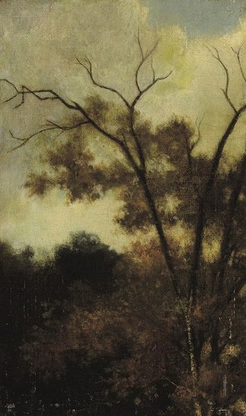 Curator: Here we have "The Winter Sun" by John William North, currently held in the Tate Collections. The support measures 667 by 984 millimeters. Editor: It feels like a memory, fading at the edges. That subdued palette is doing something melancholic to me. Curator: North was associated with the idyllic strain in English landscape painting. He exhibited at the Royal Academy, but later became disenchanted with the London art world. Editor: You know, it's that bent tree in the foreground that gets me. It's like a gesture of surrender, bowed down but still reaching. Curator: His works often depict rural scenes, reflecting a longing for a simpler, more natural existence, a sentiment that resonated with the Arts and Crafts movement. Editor: I appreciate how North managed to evoke this atmosphere of tranquility. It makes you want to curl up with a good book. Curator: Indeed. The artwork offers a glimpse into the artist's own reflections on the changing face of the English countryside. Editor: What a lovely invitation to reflect on our own connections to the natural world.