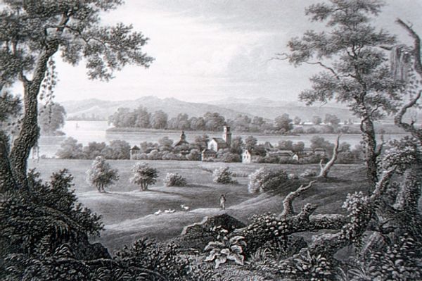 Editor: Here we have Christen Købke's pencil drawing, "Amtmand, Kammerherre Jens Andreas Graah," created between 1836 and 1838. It's quite a detailed landscape, but there's a quiet stillness to it. What catches your eye in this piece? Curator: The trees! They aren't just background; they're almost characters, gnarled and reaching, witnessing the scene unfold. Doesn't it feel like they're guarding some unspoken story? I find myself wondering what kind of tales they could tell if they could speak. Then, consider that little figure tending the flock…does that remind you of the old pastoral paintings, the kind where life is idyllic? But there's something slightly melancholic here, wouldn't you agree? Editor: Yes, definitely. The muted tones contribute to that feeling, and the landscape beyond the gate seems vast and perhaps a bit lonely. So it’s a landscape, with romanticism elements, that suggests a bit more. Curator: Precisely. Kóbke captures the romanticism’s admiration of nature but imbues it with an intimate observation. Notice how different light and shadow play across the forms. Can you feel a slight breeze perhaps? Editor: I do get a sense of weather within a tranquil landscape, now that you point it out. A landscape where time and memory sort of come together…almost like a faded photograph. Thank you! Curator: It’s about light and memories… Perhaps. Thank you. I will consider it that way!