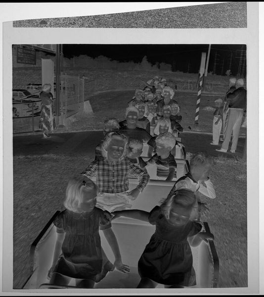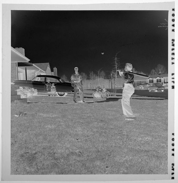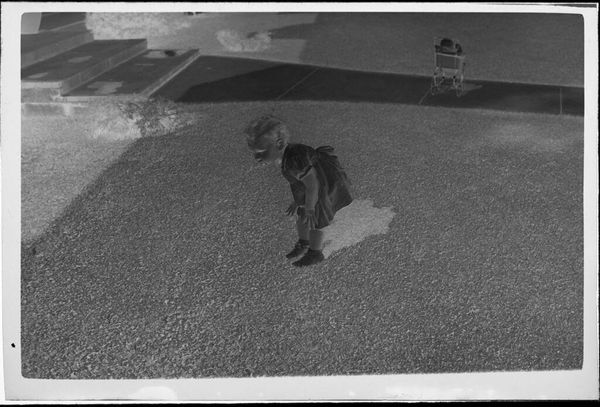Editor: This silver gelatin print, "Untitled (boy riding bike with "press" basket)" by Lucian and Mary Brown, shows a boy on a tricycle with the word "PRESS" emblazoned on the front. It feels very staged. What do you see in this piece? Curator: The production of this image, using the silver gelatin process, suggests a specific historical context and the labor involved. The “PRESS” label on the tricycle implicates the child in a system of information dissemination, perhaps even propaganda. It makes me wonder about the social implications of early media consumption. Editor: Propaganda? That's a strong word. I was thinking it's just a playful childhood scene. Curator: Playful, perhaps, but also consider how the materials and presentation—the photograph itself—become tools shaping perceptions. This image raises questions about the manufacturing of childhood innocence and its relationship to power structures. Editor: I hadn't considered that. The idea of manufacturing innocence is unsettling. Curator: Exactly. It forces us to consider the material conditions that shape our understanding of even the most seemingly innocent subjects. Editor: Thanks for sharing your insights! That has really opened my eyes.