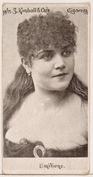 Editor: This is "Card Number 145, Miss Johnson," dating back to the 1880s, created by W. Duke, Sons & Co. It’s an albumen print, and it strikes me as such an odd object—a portrait intended as cigarette packaging. What's your take on this work? Curator: It's fascinating to consider this photograph as both a promotional tool and a piece of social history. These cards were inserted into cigarette packs, yes. But think about the larger cultural context. How did the rising popularity of cigarettes intersect with the burgeoning entertainment industry and the commodification of celebrity? This was all happening around the same time. Editor: So, Miss Johnson, an actress perhaps, is literally packaged alongside a vice. It seems so exploitative. Curator: Absolutely. This card participated in a system that objectified women, transforming them into collectible commodities, readily available for consumption along with tobacco. Consider the gaze—who is looking at this image, and what desires are being catered to? What is she meant to be ‘selling’ with her image, besides cigarettes? Editor: I never thought about it that way. It feels different than other celebrity portraits I've seen. Curator: These images, because of their wide distribution and disposable nature, arguably played a significant role in shaping popular perceptions of beauty, success, and fame, long before the age of cinema and mass media. Editor: So it's less about Miss Johnson as an individual and more about what she represents as an image in that era. Curator: Precisely. Understanding its place in the cultural landscape helps us see beyond just a pretty face and engage with the power dynamics at play. Editor: That gives me a lot to think about! Thanks for sharing that insightful perspective. Curator: It's been a pleasure. Considering art’s interaction within social contexts always gives a new lens to these items.