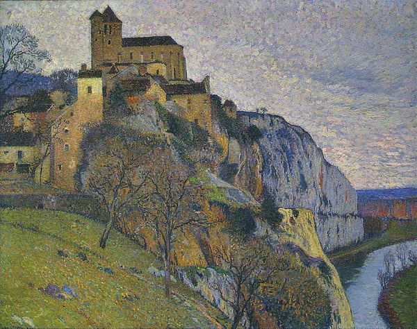 Curator: Looking at this work, I feel immediately drawn into its hushed, contemplative atmosphere. The muted colors and dense brushwork evoke a sense of quiet observation. Editor: You've articulated that beautifully. We're looking at "Saint-Cirq-Lapopie", a landscape painting attributed to Henri Martin. Its style situates it within post-impressionism, a fitting label considering the time that he worked in. Martin was part of the artistic milieu that included influences from Symbolism and Neo-Impressionism. Curator: The town itself, perched so precariously on the cliff, becomes an almost allegorical symbol of resilience, doesn't it? The way the buildings seem to grow organically out of the rock face, they almost feel like a fortified embrace with nature itself, in this sort of medieval dream. Editor: Absolutely, this painting reveals layers of symbolism related to medieval and national identity. You have the picturesque village with the implied fortress representing the quintessential "Frenchness" idealized during the Third Republic. Saint-Cirq-Lapopie was also classified as one of the "most beautiful villages of France," feeding into this narrative. What are your thoughts on the light here? It almost feels dreamlike. Curator: I agree! The muted, silvery light definitely enhances that dreamlike quality, evoking feelings of timelessness and serenity. In a broader sense, that also signifies something larger about how the "village" has entered the cultural consciousness; that feeling transcends the reality of daily life, no? Editor: Precisely. This idealization obscures a complicated socio-economic reality and presents instead, an unsullied picture of rustic Frenchness for public consumption. This painting presents a view into the making of cultural heritage. Curator: Fascinating. I came away initially with only its immediate visual effect. Thanks to you, I have a richer sense now of the cultural and social narrative at play within. Editor: My pleasure! Considering those points, it really reframes the feeling that remains when one stands before the work.