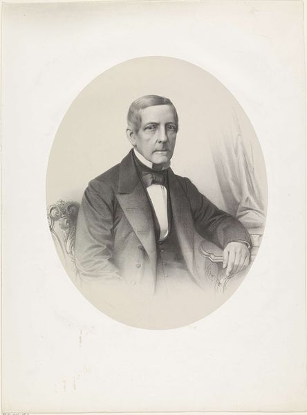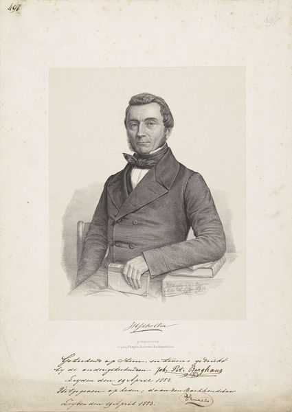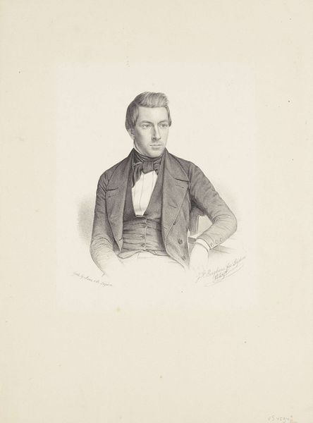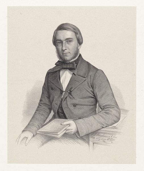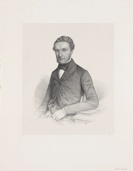 Johann Peter Berghaus created this portrait of an unknown man in the 19th century. The lithograph features a man in a suit, his gaze direct, set against a neutral background. This lends a solemn and imposing air to the image, enhanced by the formal wear of the time. The composition is structured to focus on the man’s face, meticulously rendered to capture his features. Berghaus uses hatching to define the contours of the figure, lending depth and texture to the man's clothing and face. The stark contrast between light and shadow creates a sense of realism, drawing the viewer's eye. The man's poised demeanor and the book beneath his hand are cultural codes which represent intellect and social standing. Through a network of signs, Berghaus invites us to consider the identity and status of the sitter. The artwork functions as a meditation on representation, inviting ongoing interpretations and discussions.
