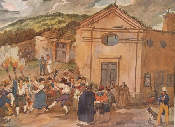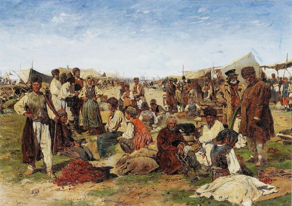 Curator: Alfred Dehodencq painted this scene, entitled "Running of the Bulls in Spain", in 1850. It offers a snapshot into a popular, if controversial, cultural event. Editor: My immediate sense is controlled chaos, an organized frenzy, and frankly, it all looks quite dangerous. The ochre palette really hammers home that dry, dusty arena. Curator: It's a compelling depiction of Spanish bullfighting culture during the mid-19th century. Dehodencq's decision to paint it "en plein-air" really connects it to Realism and Romanticism in that time period. You can see he focused on the scene, not idealizing it too much, capturing a sense of place and action, whilst highlighting an inherently dramatic situation. Editor: Note the rough texture of the surface, presumably achieved through layering oil paint. This seems central to its impact. The materiality almost amplifies the grit and violence of the scene itself, it's not sanitized. What are we really consuming, watching this painted scene or participating in this barbaric one? Curator: Certainly, the underpainting creates that base layer which gives depth, yet one must consider Dehodencq’s position within the debates regarding Romanticism versus Realism during this period. Dehodencq seems to emphasize the event’s role in constructing Spanish national identity, its symbolism, and the power dynamics at play. It goes far beyond simple representation of technique or production of a painterly surface. Editor: The consumption of 'Spanishness' was certainly lucrative, wasn't it? Dehodencq knew this spectacle, reproduced on canvas, would sell precisely because it feeds into the narratives Western audiences expect. The 'danger' adds an irresistible thrill. The very process of oil painting contributes to an aestheticization that needs a critical eye. Curator: I see your point. Ultimately, Dehodencq presents us with a moment of both spectacle and tradition. The artwork prompts viewers to confront difficult questions about cultural identity. Editor: For me, Dehodencq's 'Running of the Bulls' forces us to confront not just a spectacle of a cultural ritual, but the role art plays in that performance, where aesthetics and economics collide. The dust-filled arena of our looking needs cleaning now and again.