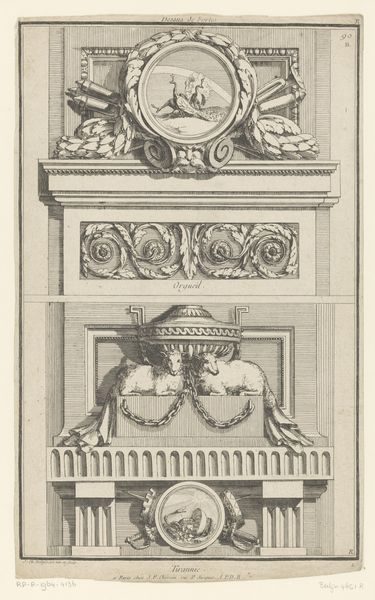 This print shows an ornate chimney-piece with a vase, made by an anonymous artist. The print captures the fine detail of wood carving, an intricate, skilled craft. Look closely and you'll see that the design incorporates classical motifs with floral elements. The chimney-piece itself is a substantial architectural element, suggesting a grand interior, most likely a home of someone with considerable wealth. The labor involved in creating such an elaborate design would have been considerable. Each element of the ornament likely hand-carved, demanding a high level of skill and precision. The print preserves and disseminates this design, making it accessible to a wider audience. It serves both as a record of craftmanship and a source of inspiration. Thinking about the relationship between labor, design, and consumption encourages us to expand our appreciation of objects. Appreciating them not only for their aesthetic qualities, but for the human effort embedded within them.