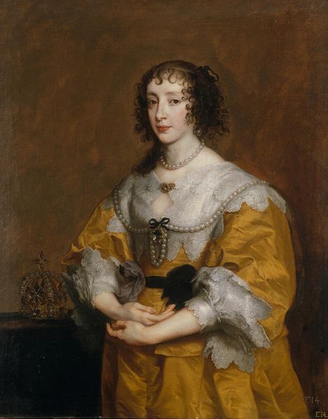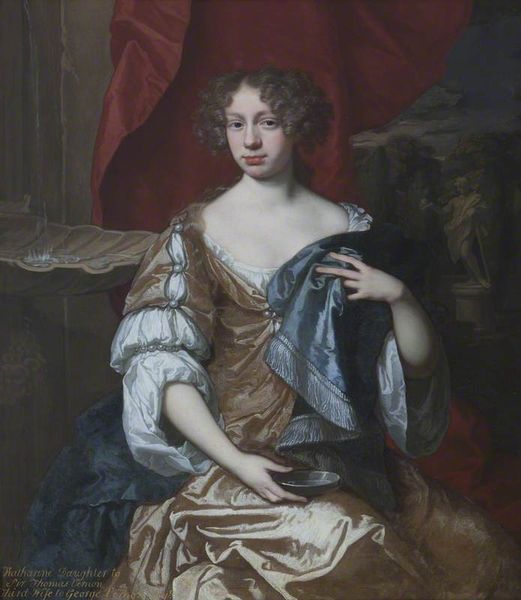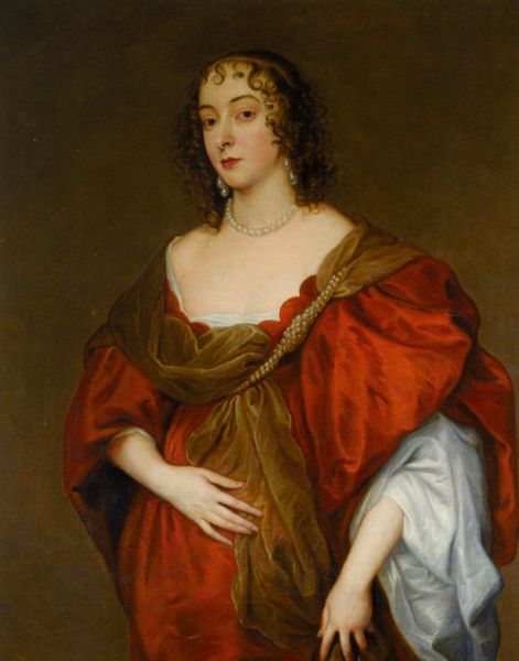 Editor: Here we have Sir Anthony Van Dyck’s "Portrait of Mary Hill, Lady Killigrew." The folds in that fabric look so rich and heavy. What can you tell us about the materials used and the context in which this was made? Curator: Van Dyck's portraits were essentially luxury goods. Consider the pigments, likely sourced globally, ground by workshop laborers. That shimmering fabric? Its production involved complex trade networks and, potentially, exploited labor. Editor: So, even the creation of the portrait itself was a commodity? Curator: Precisely. Van Dyck wasn't just making art; he was participating in a system of social and economic display, where the means of production become part of the message. Editor: It makes you see the painting with completely new eyes. Thanks for sharing! Curator: My pleasure!