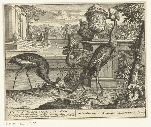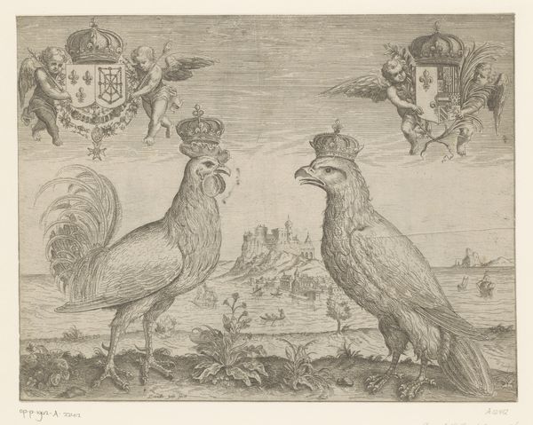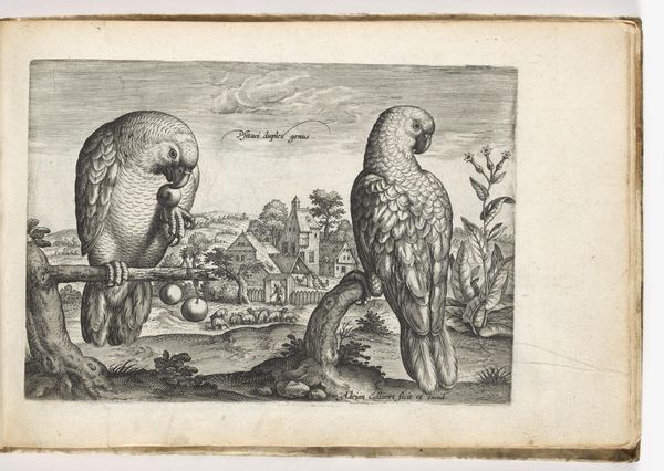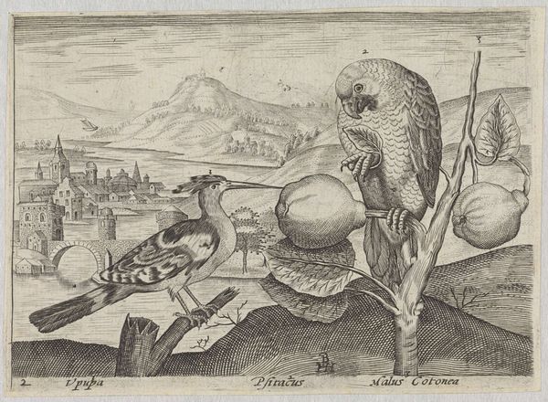 This print, made by Johann Hogenberg around the turn of the 17th century, depicts a landscape populated by flora and fauna, rendered with the precision characteristic of the Northern Renaissance. Consider the symbolic weight carried by each element. Here an eagle—a symbol of power—towers over its prey in a harsh assertion of dominance. The eagle is framed by the calendula and Malus Punica (pomegranate), elements often associated with themes of healing and fertility. Set against the backdrop of a quaint village, these symbols create a fascinating tension. Hogenberg invites us to reflect on the complex interplay between nature and culture. In a society governed by strict hierarchies, such images served not only as scientific records but also as moral allegories, reinforcing prevailing ideas about social order and divine will. How do you feel about the use of nature as a mirror for society's values and power structures?