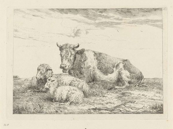 Curator: Up next we have "To får", meaning "Two Sheep", an engraving by Johannes Wilhelm Zillen, dating from 1857. Editor: Immediately, there’s a starkness to this image. The scene is rendered with fine lines, emphasizing the stillness and isolation of these sheep. It evokes a sense of quiet solitude, doesn't it? Curator: The precision of the line work is interesting; Zillen was very invested in using realism to represent aspects of rural life, specifically domestic animals. Sheep are, after all, highly symbolic within the Christian tradition. They represent gentleness and innocence. Do you see this echoed in the portrayal of the animals? Editor: I do, but there is a deeper political reading available as well. Given the period, the mid-19th century, one might argue that sheep, traditionally associated with pastoral care, could symbolize the exploited rural populace in the face of burgeoning industrialization. Their docility becomes less about innocence and more about vulnerability in the face of societal forces. Curator: An interesting, albeit pointed reading! I can definitely see that interpretation adding another dimension. Zillen's masterful strokes really draw you in, allowing one to consider the simple beauty of rural creatures and reflect on greater societal impacts on the everyman in society. Editor: I agree. It invites introspection about how seemingly simple images often hold deeper narratives, especially when considering their cultural moment and context. Curator: Absolutely. These sheep aren’t just sheep; they represent much more when placed in conversation with history and social issues. Editor: And it’s that multilayered interpretation that keeps the artwork so relevant, doesn’t it? Even almost two centuries later! Curator: Yes, exactly. What remains consistent are the psychological relationships people form with symbols and depictions of animals like this, something worth observing for those of us willing to look.