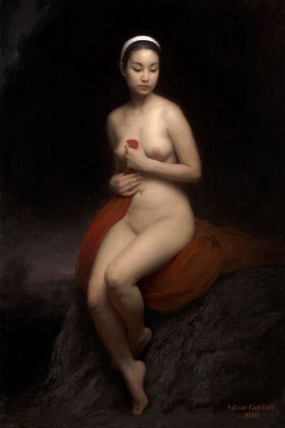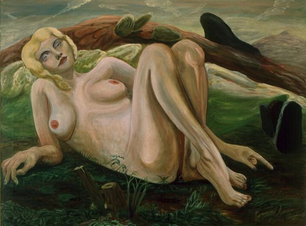 Curator: This painting, titled "Blonde," created in 2006 by Rose Freymuth-Frazier, utilizes oil on canvas to present a compelling figurative scene. Editor: It has a very hazy, almost dreamlike quality. The woman’s pose is classic, yet something about the diffused light gives it an unexpected intimacy. It feels as if the artist tried to capture a very personal moment, rather than present a polished, staged tableau. Curator: The pose evokes the reclining Venus, certainly. Consider how that imagery functions historically and even psychologically. From antiquity onward, such images codified notions of idealized beauty and feminine allure. Here, however, Freymuth-Frazier seems to subtly interrogate these tropes. Editor: I agree. The stockings and the loose, almost disheveled hair imply an after-the-fact vulnerability, rather than pure seduction. She’s reclining, yes, but there's a vulnerability that subverts that power dynamic—it feels raw. I would argue it prompts questions of viewership. Curator: Precisely. The green backdrop creates an intriguing contrast with the figure's luminosity. Note also that the color of the background, almost murky, might subtly allude to classic symbolism, with its dual ties to concepts of renewal, envy or corruption, it depends on the interpretation. Editor: That interplay you’re mentioning shifts the focal point towards an interior state. It begs us to reflect on our gaze. The art market's history tells us how bodies are consumed, by both viewers and institutions alike. This might challenge the very way the painting interacts with exhibition settings, questioning who is positioned as observer and who is observed. Curator: Very well. It brings to mind debates about the role of the artist’s intention, reception of imagery, and the museum's impact. It provides a complex dialogue across both our shared cultural lexicon of classical paintings and current discourse about sexuality, commodification, and the display of the human body. Editor: A final point is that her art could easily engage in social spaces now with fresh interpretations on beauty, self-regard, and seeing; it goes way beyond historical views, in my mind, given this renewed focus on who has visibility and control in art.