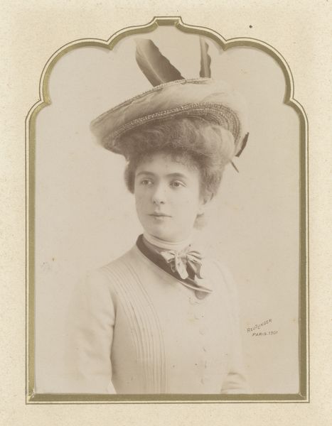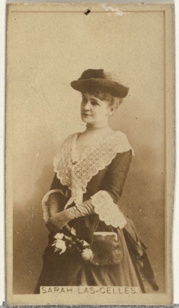 Curator: Looking at this gelatin silver print from the late 19th century is like catching a whisper of a bygone era. What do you sense from it initially? Editor: Well, aside from the visible wear and tear that suggests the passage of time, there's an undeniable formality to it. This portrait emanates an air of composed, almost melancholic gentility that's really intriguing. Curator: That's precisely the magic of it, isn't it? This photograph features Louise Montague, an actress whose image, produced by Goodwin & Company, graced cigarette cards. The whole thing speaks to the commodification of fame. Editor: Absolutely. Consider the implications: A woman's image, divorced from her agency, is used to sell a product, aligning beauty with a potentially harmful addiction. This also fits into larger systems of celebrity endorsement and advertising from the period, where personal identity becomes a marketable commodity. It feels inherently exploitative. Curator: But there's something almost beautiful in the sheer volume of such images that survive. So many glimpses of so many faces, stars in their own time. There’s also something to be said about portraiture democratized: imagine having a likeness made available not to paint but to possess cheaply and casually. It captures an ambition for the common folk. Editor: That's a perspective worth noting. Yet, this distribution normalizes the consumption of both image and commodity in parallel. It prompts reflection about women performers whose worth in those decades was defined by beauty, fame, and accessibility. The photo reminds us that the personal image and social and commercial dimensions can often converge in complicated and morally ambiguous ways. Curator: Ambiguity, indeed! To me, seeing her image, repurposed for commerce, creates this fascinating echo that forces me to reconcile past norms and ethics. Louise becomes not just a person, but a mirror reflecting our evolving social consciousness. Editor: Yes, exactly. It underscores how photographs of people of color and other groups in analogous portraits have become instrumental archives through which we may study patterns of identity, marketing, and power dynamics over generations. Curator: What a potent distillation of a photograph’s power - a fragile remnant with robust narratives for our contemporary gaze. Editor: I couldn't agree more; a haunting testament to progress and an acknowledgment of the issues left to resolve.
