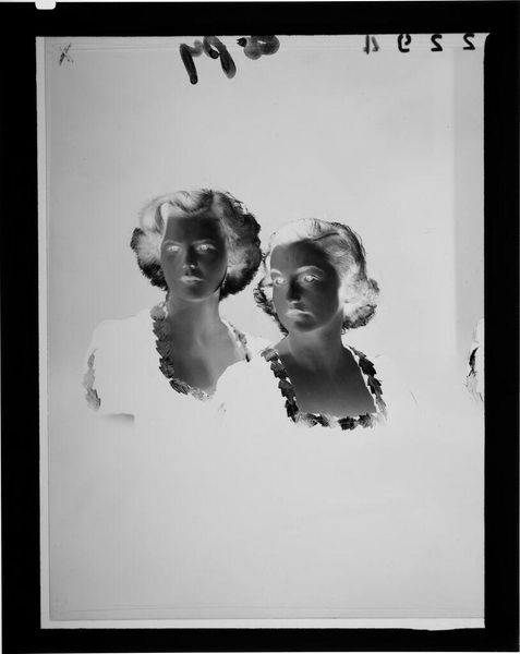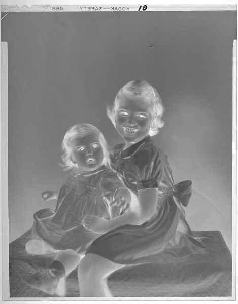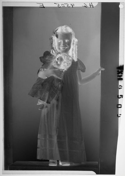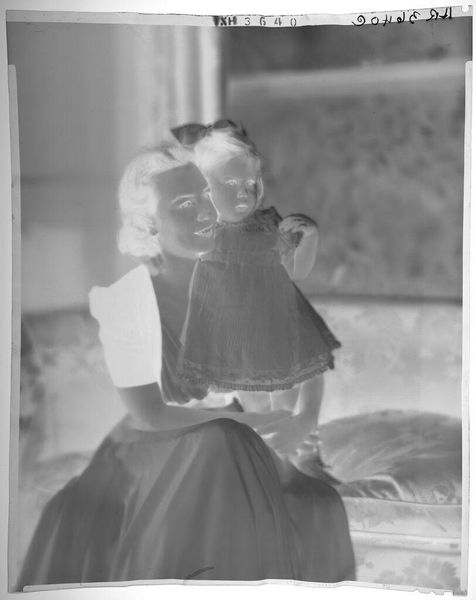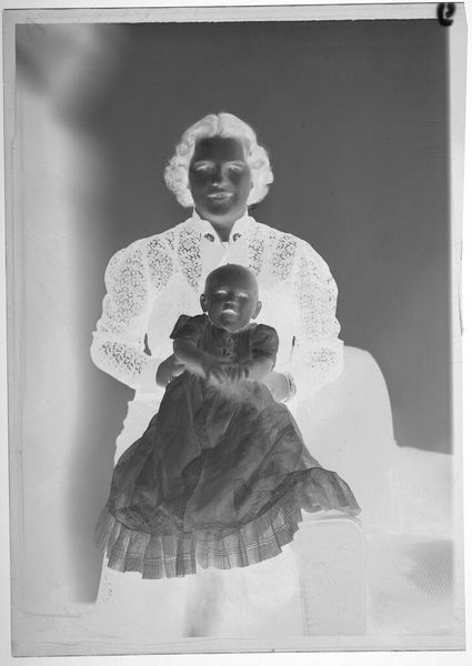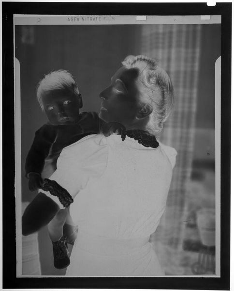 Curator: This is an untitled photograph by John Deusing, simply called "mother and baby". Editor: It's ghostly, almost like a memory surfacing. The inverted tones give it an otherworldly feel, don't you think? Curator: Absolutely, and it's fascinating how universal the Madonna and Child motif is – here, it feels both intimate and strangely detached. The stark contrast emphasizes the protective gesture of the mother. Editor: And the baby's gaze, so direct! It cuts through the visual noise, grounding the piece in raw human connection. It’s like looking into the eyes of generations past and present. Curator: It's a tender moment captured in an unusual way, leaving us to ponder the eternal bond. Editor: Yes, a visual poem, fleeting and resonant.