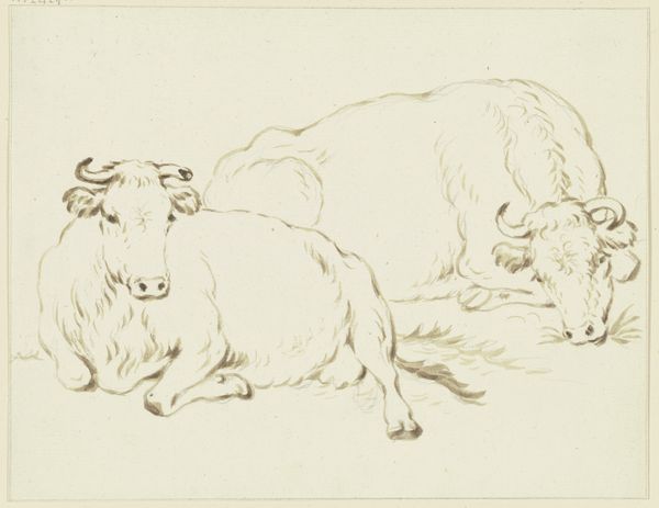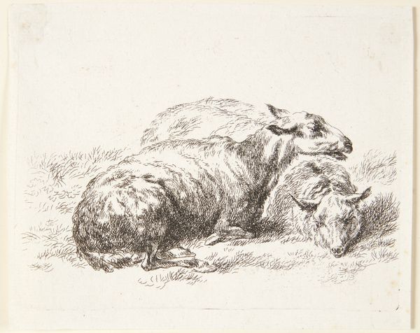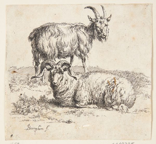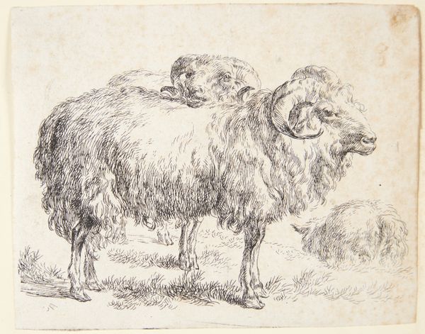 Nicolaes Berchem created this small etching titled 'Two Rams.' Observe the meticulous lines that build up the rams' woolly coats, creating texture that almost invites touch. Berchem's use of line is not just descriptive; it is also structural, giving form and volume to the animals. The composition, while simple, is carefully considered, placing the rams in a way that leads our eye across the image, from the prominent ram in the foreground to the more subdued figure behind it. The etching technique itself, with its capacity for fine detail and subtle gradations of tone, is integral to the artwork's effect. The stark contrast between the dark lines and the light paper heightens the tactile quality of the rams' fleece. Ultimately, 'Two Rams' is a testament to the power of line and texture, revealing the structural potential inherent in the etching medium. It shows us that even in a seemingly simple pastoral scene, complex formal relationships are at play.