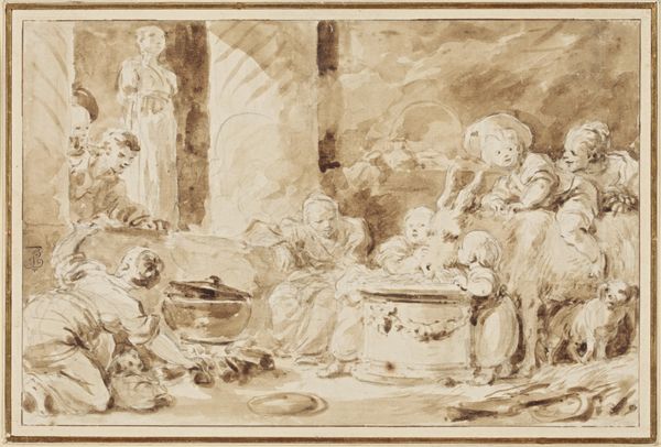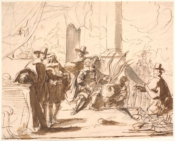 Curator: Look at this arresting drawing! It's entitled *The Degradation of Haman before Ahasuerus and Esther*, dating back to the 1630s and currently residing at The Art Institute of Chicago. Editor: It's executed so deftly with pen and ink. The light, sepia wash over the figures evokes a somber and, frankly, rushed quality. What story is being told here? Curator: Ah, you've noticed the tonal choices already! This work captures a key moment from the Book of Esther. Haman, having plotted against the Jews, finds his schemes revealed, leading to his humiliating downfall. See him prostrate himself before King Ahasuerus and Esther? Editor: The social structures and performance are potent. I immediately think about the costuming. Look at all the luxurious details on King Ahasuerus' and Esther’s garb; compare this material affluence with the abject posture of Haman as he's about to pay the price for his plot. You feel that hierarchy, right down to the fibers and ornamentation on their royal gowns. Curator: Absolutely! And there's such psychological weight carried in the body language. Ahasuerus looms with a commanding presence, while Esther regards Haman with what seems like righteous judgment. In the biblical narrative, Esther holds immense significance as a figure of courage and intervention. The visual hierarchy reflects that. Editor: There’s also such deliberation to the use of materials in the actual execution of this. The quick strokes of the pen convey a narrative urgency; the minimal materials serve a story with so much pomp. Was it perhaps commissioned? It feels like a preparatory study of some kind. Curator: The spontaneity does hint towards this. Even with such limited tonal and chromatic range, Anonymous manages to communicate nuanced expressions and regal splendor! We see the continuity of visual archetypes like kings and queens that convey timeless narratives of power and fate. Editor: Well, in observing *The Degradation of Haman before Ahasuerus and Esther*, I am most struck by how its raw aesthetic choices amplify its themes of social turmoil and retribution. It’s impressive. Curator: Indeed, a superb showcase of visual economy wielded to maximum emotional impact.