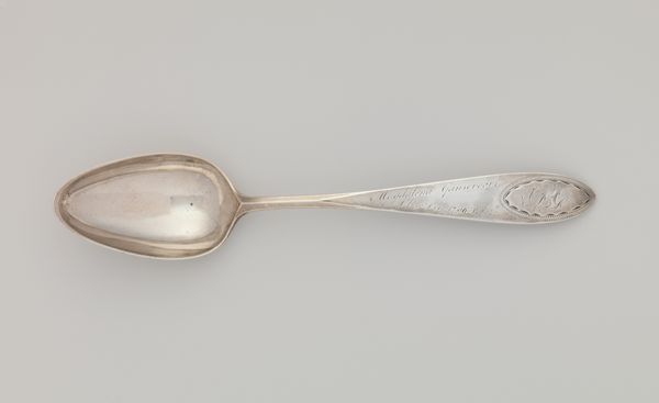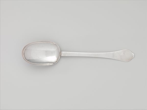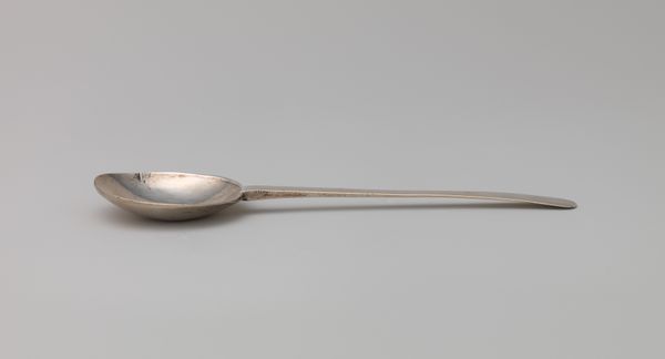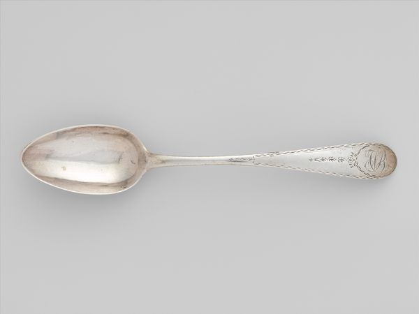 Editor: Here we have a silver teaspoon, made by Christian Wiltberger, sometime between 1770 and 1800. It feels very unassuming, almost ordinary. I wonder what its story might be. How would you interpret this seemingly simple object? Curator: Well, it's precisely that ordinariness that's interesting. Everyday objects like this spoon offer unique insights into the lives of people in the past. Consider the socio-political context. Who owned this spoon? Was it a signifier of status in a burgeoning republic, still wrestling with the legacy of class divisions? Editor: That's fascinating, I hadn't thought of it that way. So the spoon becomes more than just a utensil, but a symbol of social identity? Curator: Exactly! Silverware in the late 18th century was an investment, a display of wealth and refinement, carefully curated for public consumption. Also, notice the initials engraved on the handle. Who was that person, and what was their place in society? What stories could this spoon tell us about them, and about the rituals of dining and hospitality during that era? Editor: It's incredible how much history can be embedded in a single teaspoon. Curator: Precisely. Museums aren’t just repositories of art; they’re stages where objects perform, revealing the complex interplay between material culture and social power. Looking closer transforms a mundane object into a lens through which to view the past. Editor: I’ll definitely think differently about silverware now! I understand how such a seemingly basic item connects with so many layers of societal context. Curator: Absolutely. Each object holds a multitude of narratives waiting to be uncovered.