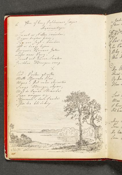 This is Johan Thomas Lundbye's "View over a landscape with a fjord, plus verses. Page 26", an ink drawing on paper. The upper half presents a landscape sketched with delicate lines. Note the horizon line which sharply divides the composition, creating a sense of depth. Trees are rendered with quick, repetitive strokes, providing texture and suggesting movement. This minimalist approach captures the vastness of the Danish landscape, evoking a feeling of openness and quietude. Below the drawing, handwritten verses add another layer to the artwork. The script, like the landscape, is rendered in fine lines, creating a visual harmony between text and image. This merging of word and image invites us to consider the interplay between visual and literary representation, suggesting that the experience of landscape is both seen and felt, observed and articulated.