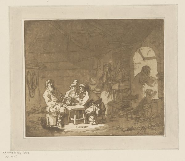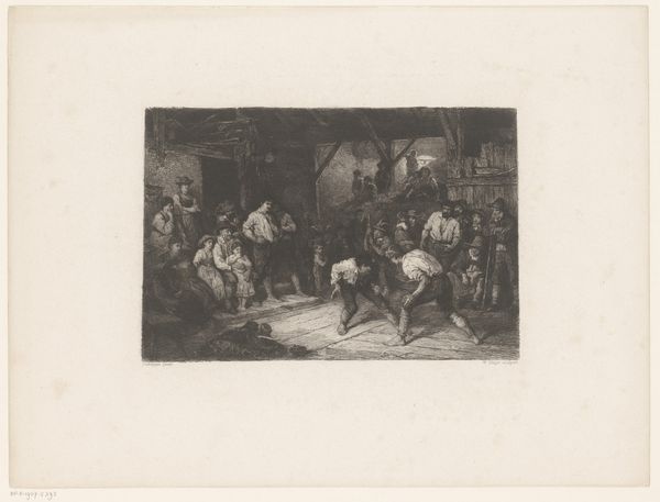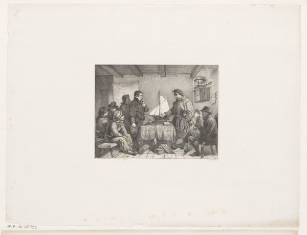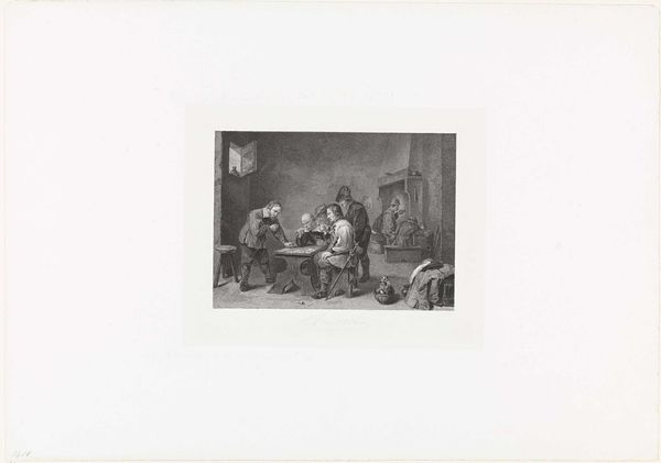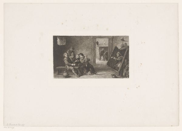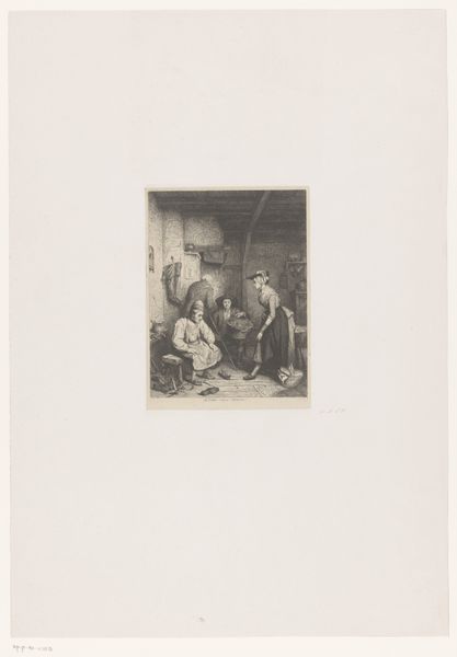 Charles Billoin made this print, "Traveler and his page entering the inn", in the Netherlands, most likely in the mid-19th century. It depicts a common scene of the era: a well-to-do traveler arriving at a humble inn with his servant. The image creates meaning through a clear visual contrast between the traveler and the inn's inhabitants. Their clothing, posture, and the simple fact that one has a servant and the others do not, speaks volumes about the rigid social hierarchy of the time. It reflects the social and economic structures of 19th-century Netherlands, a society still grappling with the legacy of its colonial past and the rise of industrial capitalism. Understanding this print fully requires attention to the social history of the Netherlands, the role of inns as social spaces, and the visual codes that signified social status. Researching period literature, economic data, and even fashion history could provide a richer understanding of this seemingly simple scene.
