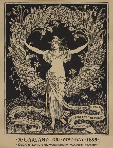 Curator: "The Chap-Book," a poster created by Will Bradley in 1898, offers an intriguing glimpse into the aesthetic sensibilities of the late 19th century. What catches your eye first? Editor: It's definitely the ethereal, almost ghostly, figures. They seem plucked from a medieval romance but also have this distinctly modern edge. The high contrast and intricate linework are striking! Like an illustration in a forgotten grimoire. Curator: Bradley’s work often references historical styles, blending Art Nouveau with elements drawn from the Arts and Crafts movement. He was very interested in medievalism, and in works that explore the intersection of literature and visual culture. "The Chap-Book" itself was a literary magazine published in Chicago, known for its distinctive, artistic posters. Editor: Ah, that makes sense! So, the poster becomes almost like a condensed version of the magazine’s identity, right? All those swirling lines and decorative details—they scream "artistic statement" in a very charming, turn-of-the-century way. Like holding a whole world in your hand...or glancing at it on a wall. Curator: Exactly. We can understand the piece through a broader socio-cultural lens. The figure, presumably female, and costumed character hint at romanticism, yet the work pushes the idea of traditionalism because Bradley was part of a movement championing new aesthetics for print and advertising. This approach challenged gender and identity norms by depicting figures in imaginative settings, far removed from their domestic spheres. Editor: See, I totally dig that duality! This poster is a product *of* its time, for sure. Looking at this image I am imagining myself in the 19th century: It has the romantic, almost fantasy-like feel that a young me would be really into! This piece pulls the veil on a lost epoch. Curator: And, as a poster, its functionality complicates traditional notions of "high" and "low" art. Bradley democratizes art. He puts the ethereal into the everyday. Editor: A really neat trick to give a second life to the image, now as an audio guide prompt. The discussion we're having offers different angles through which someone might look at it and engage with it, I think.