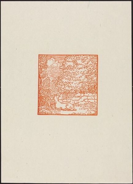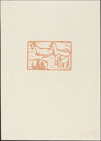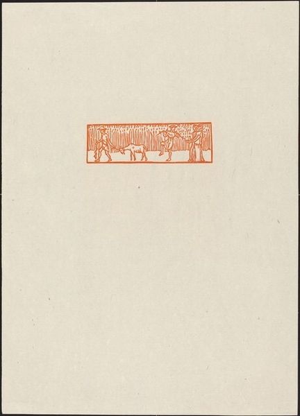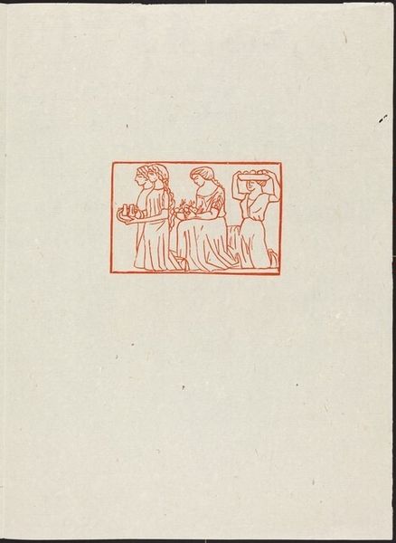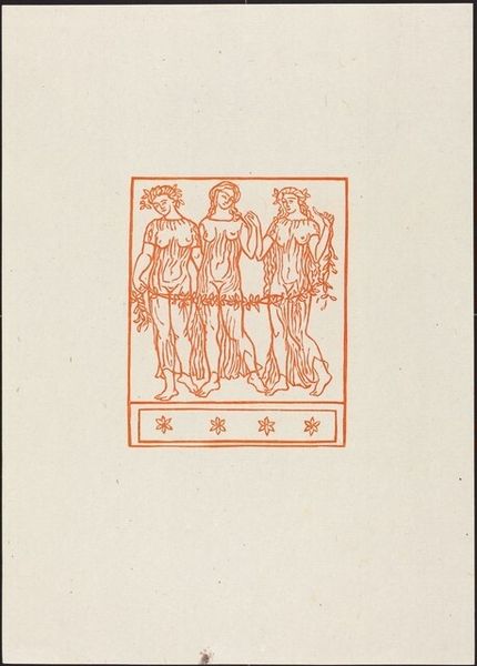 Curator: Aristide Maillol, best known for his sculptures, created this print titled "Tenth Eclogue: Pan of Arcady, Silvanus and Apollo" possibly around 1926, rendered in ink on paper, presenting us with a scene steeped in classical mythology. Editor: Well, it feels like a lost fragment from an ancient urn. There’s this understated quality about it – the earthy red ink on what looks like aged paper evokes a real sense of antiquity, doesn’t it? Almost as if we're peeking at a ritualistic procession. Curator: Indeed. The figures depicted reference Virgil’s pastoral poetry. Pan, the goat-legged god, and Silvanus, the deity of the woods, stand alongside Apollo. It's an imagined Arcadia, a realm romanticized as an idyllic retreat. It offers an insight into the continuing impact of classical forms in the 20th century. Maillol returns repeatedly to this pastoral theme. Editor: It's a reminder of humanity’s deep-rooted connection to nature and myth. It really gets you wondering what kind of stories were circulating that these gods represented, eh? Pan feels particularly vivid with his pipes, evoking lively celebrations amidst tranquil groves! I feel that music looking at this image! Curator: That depiction aligns with a longer trajectory of engagement with the Arcadian motif that occurs from ancient Greece to contemporary times. Maillol offers a twentieth-century iteration of the same thematic and figural dynamics present in Renaissance and Baroque artistic production. It invites us to ponder not just the individual creation, but its broader place within cultural and visual history. Editor: Looking at the placement within this printed space, there is all of this negative space. Almost makes this mini world feel… preciously preserved somehow. I mean what happens if the text around the figures went off the edges of the page or canvas. A whole different energy right! Curator: A fitting reflection to end on, acknowledging that the cultural reception and contextualization shapes the experience we can have encountering these figures. Editor: Right you are. I am eager to know how Maillol was understanding the stories and imagery present here and putting it through his filter. It sparks a desire to better understand his artistic intentions.