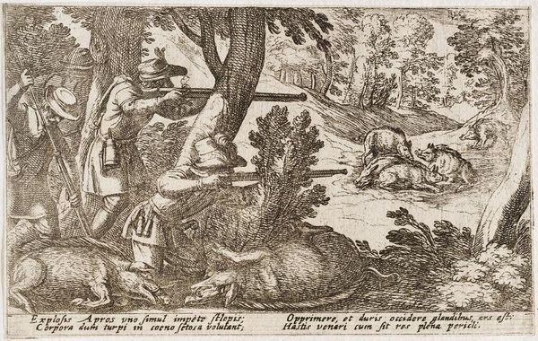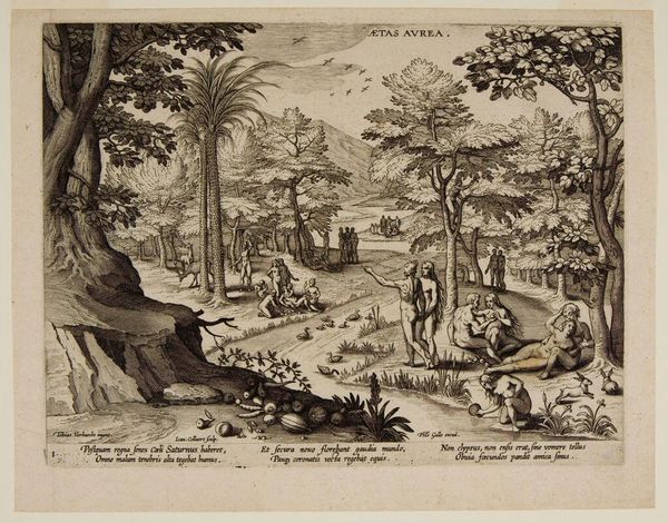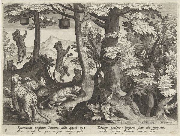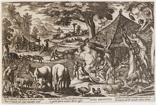 Editor: This is Antonio Tempesta's "November: Bird Hunt and Felling Trees," made around 1600. It's an etching, and I'm struck by how much detail he packs into a single scene. What compositional elements stand out to you? Curator: The spatial organization intrigues. Note how Tempesta employs a complex layering of forms, creating a sense of depth despite the monochromatic palette. Observe the placement of the trees, how they both divide and unite the various activities depicted. Does this layering suggest a hierarchy of actions or merely a simultaneous unfolding of daily life? Editor: I hadn't considered that interplay between dividing and uniting. It makes the scene feel less chaotic. What do you make of the figures themselves? Curator: They serve as integral components of the overall design. Their poses, gestures, and arrangements contribute to the intricate network of lines and shapes that define the work. Consider how their actions—hunting, felling trees, tending livestock—are interwoven with the natural environment. Editor: It's fascinating how the shapes and lines guide your eye through the image. I see it differently now.