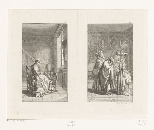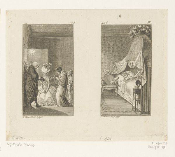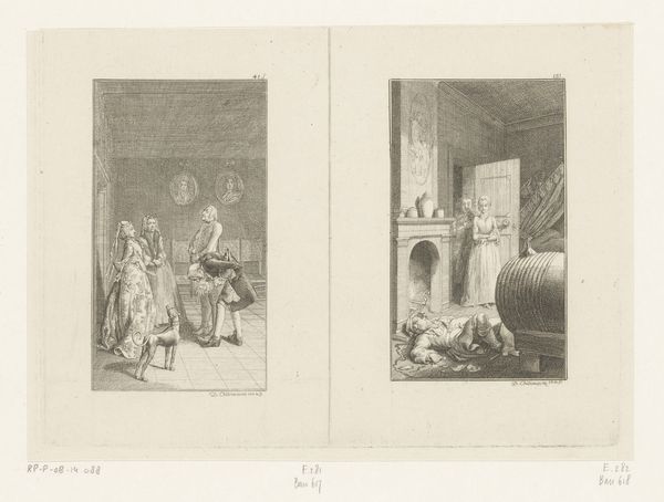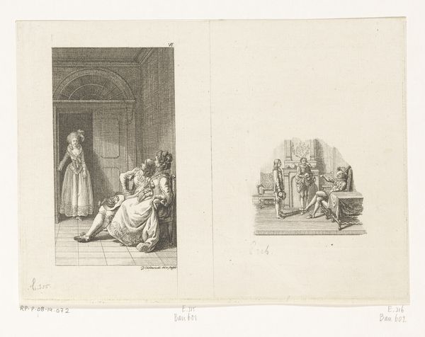 Editor: This is "Gil Blas Embraces Estella" from 1779, by Daniel Nikolaus Chodowiecki. It's an etching, and the composition with its dual scenes feels quite theatrical, almost like stills from a play. What historical contexts are relevant here? Curator: The choice of subject is deeply rooted in the literary tastes of the late 18th century. "Gil Blas" was an extremely popular picaresque novel. Chodowiecki, like many artists, drew inspiration from its social commentary. This print, as a readily reproducible image, amplified the novel's reach, turning social satire into widely consumed visual culture. Who was being depicted and how mattered significantly. Why do you think Chodowiecki chose these particular scenes? Editor: I guess it emphasizes social mobility, and maybe critiques class structures in pre-revolutionary Europe? One scene has an intimate embrace; the other has someone meeting with a bishop? Curator: Exactly. Chodowiecki highlights intimate, emotional moments alongside instances of social maneuvering. He lays bare the relationship between private desire and public performance. How might the viewers interpret it, engaging with power structures? Consider how they viewed social climbing within the Church. Did they critique such actions, and were those ideas accepted? Editor: So the artwork serves almost like a visual editorial, sparking social dialogue about the elite? Curator: Precisely! It implicates the viewer, prompting them to consider their own position within the very societal structures it depicts. The popularity of prints like this helped fuel critical discourse. Considering the socio-political climate, especially the Enlightenment ideals circulating, it questions institutional authority. Is that how you now view the narrative? Editor: I see it very differently now. The print isn't just a pretty scene, it's actually making an argument about power. It also provides commentary about class relations through imagery for wide audiences to absorb, understand, and apply to society! Curator: That's it. Understanding the cultural backdrop illuminates how art can participate in shaping public consciousness.