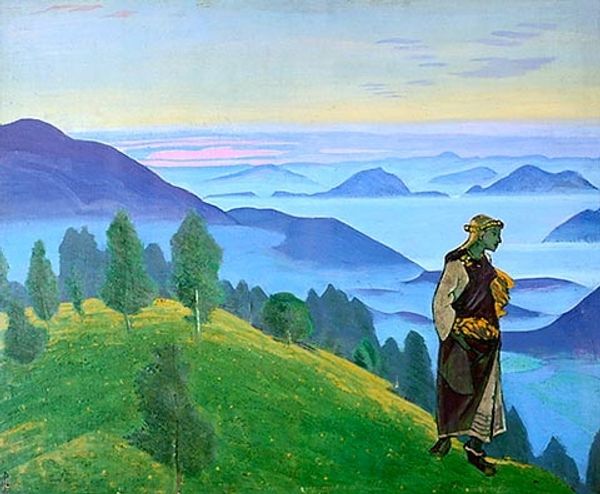 Nicholas Roerich made this painting, Sword of Courage, using tempera on canvas. Here we see an angel holding a sword, standing before what appears to be a mountainous fortress, and in the foreground, two fallen warriors. Roerich's painting reflects his interest in mysticism and spirituality, but this interest was itself shaped by the historical and political context in which he lived. Born in Russia in 1874, Roerich witnessed the social and political upheavals of the early 20th century. He traveled extensively, studying archaeology and immersing himself in the cultures of Asia. His paintings often incorporate themes of heroism, spiritual quest, and the defense of higher values. The image creates meaning through the symbolic use of the angel, the sword, and the fallen warriors, evoking a sense of moral struggle and the protection of spiritual ideals. The historian's role is crucial in understanding this painting. By studying Roerich's life, writings, and the cultural context in which he worked, we can gain insight into the complex meanings embedded in his art. Ultimately, art's significance is deeply intertwined with its social and institutional setting.