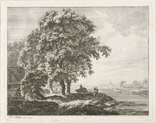 Curator: This landscape print is by Thomas Gainsborough, who was born in 1727 and died in 1788, and it's currently housed in the Tate collection. Editor: It possesses a certain tranquility, doesn't it? The etched lines create a soft, almost dreamlike quality, despite the stark monochrome. Curator: Gainsborough was deeply interested in the social impact of landscape. Notice how the scene invites contemplation, far removed from urban labor? Editor: Yes, and the composition is quite deliberate. The eye is led gently along the winding stream, a masterclass in perspective and tone. Curator: Absolutely. And consider the materials: etching allowed for wider distribution, bringing idealized nature to a broader audience. Editor: I see that. The texture of the trees feels almost sculptural, achieved through varying densities of line. I find that captivating. Curator: Knowing Gainsborough's social context, we can appreciate how this seemingly simple print speaks to a desire for escape and a critique of industrialization. Editor: A landscape imbued with so much history. It encourages a close observation of nature’s intrinsic beauty, and perhaps a touch of nostalgia too.