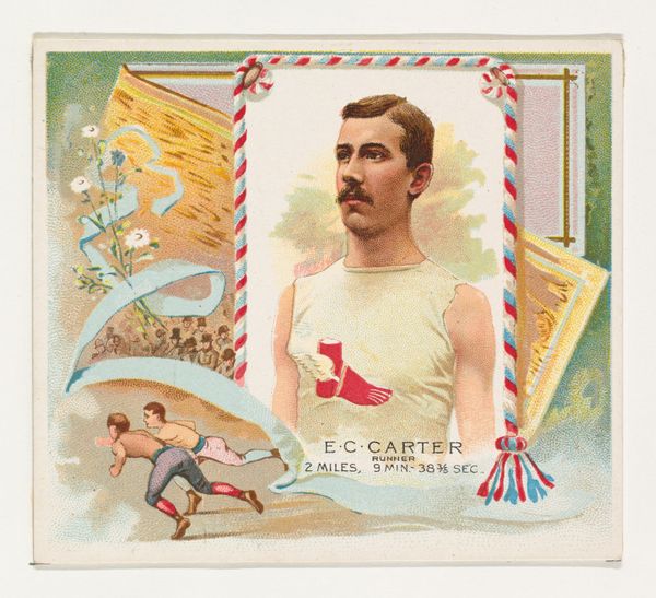 This small chromolithograph, made by Allen & Ginter for their cigarette cards, features L.E. Meyers, a champion runner, surrounded by floral motifs and classical allegories. The cherubic figure, reminiscent of ancient Greco-Roman depictions of Eros or Cupid, suggests themes of love, desire, and aspiration. Note how the image is framed by roses, symbols of beauty and ephemeral existence, echoing the fleeting glory of athletic achievement. The cherub, cradled amidst these blooms, bears wings akin to those of Hermes, the messenger god, linking earthly accomplishments with divine favor. This iconography has its roots in antiquity, where athletic prowess was celebrated as a manifestation of ideal human form, a concept that continued to echo through the Renaissance. Yet, here, the classical symbols are somewhat repurposed, reflecting the Victorian era’s complex relationship with its classical heritage. The cherub is not merely a symbol of divine love or beauty, but perhaps also a nod to the transience of fame. It is a reminder of the relentless passage of time, urging us to consider how our fleeting moments of glory will be remembered.