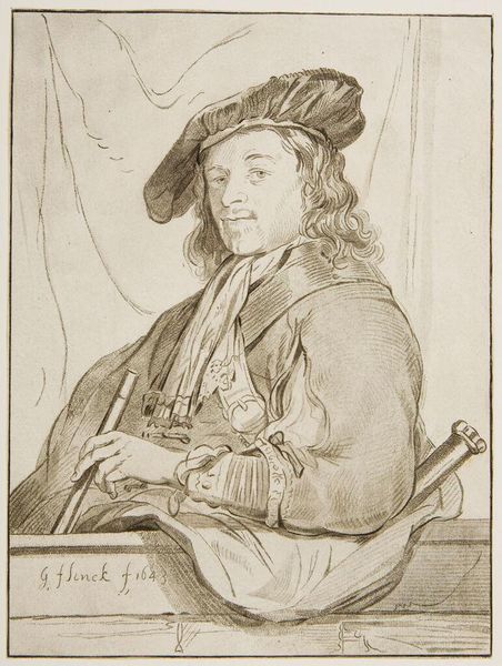 Editor: So, this is "Man bij borstwering," from 1773-1774, currently at the Rijksmuseum. It is attributed to Bernhard Schreuder. It looks like it was done with pen and pencil. It reminds me of a quick sketch... something found in a notebook. What's your take? Curator: It’s fascinating how we immediately perceive it as a “sketch,” influenced by our contemporary understanding of artistic labor. But, let's consider the materiality. Pen and pencil weren't just tools; they represented specific levels of accessibility and affordability. Who had access to these materials and the time to dedicate to such drawings? The depiction of finery of dress places him in a context of luxury. Does this drawing celebrate individual creativity, or reflect broader social structures determining who gets to create and who gets to be portrayed? Editor: That's a good point. The man’s clothing and pose definitely imply wealth. I hadn't thought about the pens and pencils as materials that weren’t easily accessible. How would that understanding change our viewing of similar sketches of everyday people? Curator: Exactly! By examining the means of production, we question whether it is a “simple” sketch. We might see it instead as a potent marker of class and access. Does this alter your understanding of "sketchbook art" in general? Editor: It really does. I’m now thinking about the labor involved, even in what seems like a quick study. Curator: It challenges the romantic idea of spontaneous genius, doesn’t it? Now, what if the work were reproduced, copied, or even forged. Would this affect our reading of it? Editor: Definitely! Copies might democratize access, but forgeries muddy the waters of authenticity and artistic labor. Thanks for opening my eyes to how materials and production shape meaning.