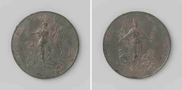 Curator: So, this is "Boerenoorlog, penning geslagen ter ere van degenen die hun leven gaven voor koning en vaderland," a bronze relief medal by Emil Fuchs, created in 1902. It depicts scenes from the Boer War. What strikes you most about this piece? Editor: Well, it’s a medal, so it's small, but it still feels... weighty. The subject matter seems serious, especially the image on what I presume is the reverse of the medal, which looks mournful. I’m curious, what’s your take on why it was made? Curator: Given its historical context, we need to acknowledge the complexities and injustices inherent in colonial wars. This medal, while ostensibly honoring those who died for their King and country, functions as propaganda, glorifying a conflict rooted in imperial expansion and the suppression of the Boer people. What message do you think the artist intended to convey, and what message might we interpret today? Editor: I guess I see how easily these kinds of objects can become tools of nationalist narratives. Was this common at the time, to produce commemorative art like this that's...basically promoting a certain viewpoint on history? Curator: Absolutely. Medals, monuments, and history paintings often served to reinforce dominant ideologies. In this case, it reinforces the righteousness of the British Empire and diminishes the experiences and perspectives of the colonized. Considering Fuchs was working in a historical tradition that largely overlooked marginalized voices, what responsibility do we have, as viewers today, when interpreting such a piece? Editor: It sounds like a challenge to unpack what’s actually going on, beyond the surface level glorification of war. I mean, it's powerful imagery, but… tainted by the politics. Curator: Exactly! By critically engaging with the medal's symbolism and historical context, we can uncover uncomfortable truths about power, representation, and the legacies of colonialism that still resonate today. Is there anything else you would like to examine? Editor: Thinking about the purpose of commemorative objects this way… it really changes how I look at them. Thanks for shedding light on that! Curator: My pleasure! Remember, art can be both beautiful and problematic; engaging critically allows us to learn from the past.