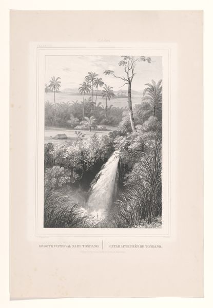 Editor: Here we have "Cascade de Garet", an etching and engraving print by Maxime Lalanne. The scene feels very enclosed, almost like a secret grotto. The stark contrast of light and shadow makes the waterfall the indisputable focal point. How do you interpret the cultural symbols and visual cues present in this landscape? Curator: This image evokes a powerful Romantic sensibility, doesn't it? The waterfall isn’t just water; it symbolizes nature’s overwhelming power, perhaps even a cleansing force. Think about the etymology of the word "cascade"— it's about things "falling." What does "falling" water, the relentless and gravitational motion of a waterfall, mean to us as humans? Editor: That’s a good point. The idea of something constantly falling... I guess that can symbolize a loss of control? Or a journey downwards, like in mythology? Curator: Precisely. Consider the visual language Lalanne employs – the stark contrast between the luminous water and the dark, jagged rocks. Do you notice how your eyes travel within this contrast, from shadow to light, back and forth? This visual duality might represent the human struggle against an indifferent, powerful nature. Think of Romanticism’s fascination with sublime terror and awe. Editor: I do. It feels like there’s a vulnerability in positioning the cascading water – life itself – in the dark embrace of the rocks. Almost as if nature both gives and takes away. Curator: And those trees at the top – are they watching, observing the scene? Landscapes, through history, have also held cultural symbolism tied to specific locales. In this landscape, the human drama unfolds within a natural theater. Lalanne’s choices tap into something timeless about our relationship with nature’s grandeur and its inherent dangers. Editor: It’s fascinating how one image can convey so many layers of meaning when you look at it through the lens of symbolism. Curator: Indeed! It encourages us to remember the persistent echoes of cultural memory embedded within visual forms.