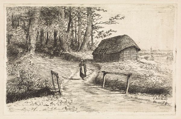 Editor: Here we have John Taylor Arms’ etching, “The Pig Pen,” created sometime between 1936 and 1940. The detail is remarkable, and the scene has a stark, almost melancholy feel to it. What do you see in this piece? Curator: Beyond the undeniable technical skill, I see a quiet commentary on rural America during the Depression era. Consider the date – mid to late 1930s. This wasn't a period of idyllic pastoral scenes. Editor: So you're saying the choice of subject, this dilapidated structure, is significant? Curator: Precisely. It begs us to ask: who occupies this space? How might this image reflect the societal and economic pressures that disportionately affect certain communities? It may speak of a disconnect between land and the promise it held, a crisis that goes well beyond what meets the eye. It's a seemingly simple scene, yet rich with complex social implications. Editor: I didn’t consider it beyond the pure aesthetic. The texture of the wood and light… Curator: Of course, appreciating the artistry is important, but we should always challenge ourselves to situate art within its relevant sociopolitical framework. It forces us to contend with difficult conversations and, hopefully, arrive at a greater historical literacy and awareness of persistent injustices. Editor: That's a powerful way to look at it. I’ll definitely remember that approach going forward. Curator: Glad to expand your view. Keep interrogating art—it will give as much as you put into it.