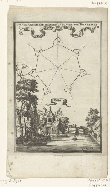 Curator: Let’s consider this engraving titled “Illustratie voor 'Den Arbeid van Mars' van Allain Manesson Mallet,” created around 1672 by Romeyn de Hooghe. It resides here at the Rijksmuseum. Editor: Immediately, I’m struck by the contrast between the almost sterile geometry at the top and the bustling landscape scene below. It's like two different worlds coexisting on one page. Curator: That tension, I think, speaks to the intersection of power and practicality. The geometric figure, labeled as 'the third rule of the Count de Pagan,' most likely served some cartographical or military function—imposing order onto the natural world. The 'Arbeid van Mars', alluded to in the artwork's longer title, relates this imagery directly to warfare. Editor: The landscape feels almost secondary, yet it's teeming with symbolic elements. The river, the buildings, and especially the windmill… it calls up well-worn tropes of Dutch prosperity, hard-won from the land and sea. It’s tempting to view these markers of the Dutch Golden Age through a celebratory lens. But where’s the darkness? Who pays for all this industry? Curator: Indeed. Consider that this "golden age" was built upon global trade networks, deeply entangled with colonial exploitation. De Hooghe himself, while a master engraver, produced works that propagated harmful stereotypes, and it would be disingenuous to not situate this image within the history of oppressive Dutch practices. This artwork offers itself for the examination of those inequalities. Editor: Absolutely. The engraving uses symbols to carry an emotional load; the windmill isn't just a windmill; the ships aren't just a merchant’s vessels; the water that facilitates prosperity isn't something shared equitably by all. Curator: By analyzing its historical and material circumstances, and foregrounding our contemporary concerns with it, we might confront the latent politics within ostensibly neutral images, which, in turn, might lead us to examine other artworks through a renewed and critical lens. Editor: By tracing the threads of imagery, this piece opens up broader historical questions that echo through collective and individual consciousness. Perhaps it's an exercise in how we might see then and, perhaps more importantly, how we see now.