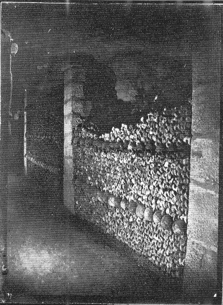 Curator: What a haunting photograph. There’s something almost apocalyptic about this 1861 gelatin silver print entitled "Catacombes de Paris," by Félix Nadar. Editor: My initial reaction is pure claustrophobia. It feels as if the weight of history, or perhaps a more literal weight of the earth, is pressing down. The contrast is striking, but what's most unsettling are the blurred shapes; the stark geometric forms looming within an uncertain space. Curator: That uncertainty, that murkiness, is what holds so much symbolic power. This photograph captures the Paris Catacombs, an ossuary holding the remains of millions. Light and shadow battle here; there’s a literal struggle of enlightenment piercing the darkness, revealing the physical bones. These skeletal remains act as symbols and tangible records of entire segments of Paris society. Editor: Right, but consider the social context of these bones, Curator. This wasn't simply a respectful relocation. The catacombs became necessary due to overflowing cemeteries and sanitation concerns that disproportionately impacted working-class communities in Paris. It exposes class disparities even in death. This also challenges our sentimental attachment to romantic ruins. We romanticize them in paintings, yes, but the political backdrop shifts our gaze. Curator: I agree to a point. Yet the aesthetic itself is potent; it embodies a certain historical drama and mystery, echoing a Romantic sensibility. The photographer uses a visual language steeped in symbolism – a subterranean world usually reserved for initiates, brought into the light, documented. But consider, Editor, it's not simply about bones; they represent human lives, individual stories merging into collective fate, an inevitable journey we all share. Editor: Fair enough, I appreciate the visual poetry, the allegorical intent; however, the composition—that stark lighting exposing these piles, one on the left as almost like a solid block—becomes a commentary, a stark portrayal of social neglect and ultimately speaks to an unequal relationship between different populations. Curator: Still, its power resides in visualizing a profound human reality: that we all end up as bone, stripped of earthly status. It allows for contemplation and ultimately connects with traditions that predate modern capitalism. Nadar's image, despite your critiques, Editor, preserves both a document of human bones, and an icon that captures and transforms our cultural consciousness about the inescapable destiny we all meet. Editor: Indeed, that image pushes viewers, despite any contextual consideration, into self-reflection. Very evocative, and that’s quite the accomplishment for a photo taken in what amounts to a mass graveyard.