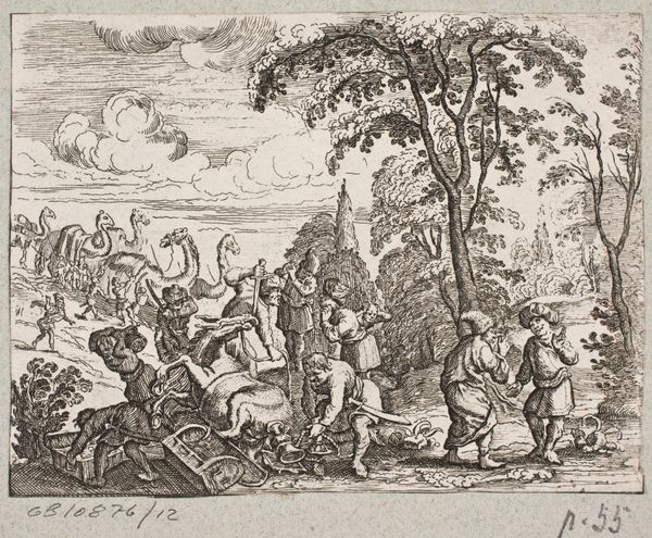 Editor: This engraving, "Allegory on Good Government in France" by Claude Mellan, created in 1685, has so much detail. The landscape teems with figures, objects, and flora. What strikes me most is how idealized everything seems. How do you interpret this work? Curator: Indeed, this isn't just a depiction of governance; it's an *allegory*, which speaks through a visual language of symbols. See how Minerva, with her helmet and spear, guides the young Louis XIV? What emotional weight do these classical allusions bring, considering the absolutist reign of the Sun King? Editor: They definitely lend a sense of authority and timelessness. Minerva represents wisdom, I assume? What about the figures surrounding the tree with the inscription? Curator: Precisely! The inscription likely contains laws or principles. The figures there embody virtues. Look closely at what lies on the ground – abandoned weapons, books… Notice anything about that oak tree and what it symbolizes? Editor: Okay, the abandoned weapons could represent peace brought about by good governance, and the oak tree is usually symbolic of strength and stability... So, good governance brings peace and stability? Is it that straightforward? Curator: On one level, yes, but the image engages in myth-making. How might such allegories have functioned to shape public perception, memory, even obedience during the era of Louis XIV? Are there similar motifs across cultures and periods? Editor: So it’s about shaping a specific cultural memory. That's fascinating; it makes you think about how images can legitimize power. Curator: And how that visual language persists. Exploring art like this reveals that continuity, doesn't it? A chain of symbols linking us to the past and shaping our present. Editor: I hadn't thought about it like that before! Now I'm seeing symbols everywhere.