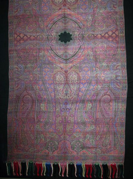Editor: This is a shawl from the 1860s by Clabburn, Sons and Crisp, currently held at the Art Institute of Chicago. It's a textile artwork, bursting with pinks and oranges. I’m really struck by how intricate the pattern is; it’s almost dizzying! What can you tell me about this work? Curator: Oh, dizzying is the word, darling! It's like falling into a kaleidoscope. These paisley patterns – each a tiny universe – they were wildly fashionable at the time, weren’t they? They became quite popular around this period. Look at how densely packed the motifs are, each swirling teardrop fighting for space. Do you sense a kind of visual tension there? Editor: Yes, definitely a tension! It feels almost overwhelming, in a way. Is that typical of these shawls? Curator: Exactly! Think about the women who wore these. It was a signifier of status, sure, but I also think there's something powerful in cloaking oneself in this swirling vortex. Almost a form of…dare I say it…quiet rebellion against Victorian restraint. What do you think? Editor: That's a fascinating way to look at it, actually! I had been thinking it was just decorative, but you've given me a whole new perspective. The intricacy almost becomes a statement. Curator: Precisely! It’s a reminder that even the most decorative objects can hold stories. And maybe even a little bit of mischief, don't you think? Editor: Absolutely. I'll definitely see shawls differently now. Thank you!