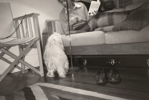 Editor: This is an untitled photograph by Lucian and Mary Brown, showing a baby gazing at a framed picture of an officer. It strikes me as a very intimate, domestic scene, but it also suggests a connection to broader social structures. How do you see its historical context influencing this image? Curator: That’s a perceptive observation. Consider the post-war period; military service and its associated imagery were deeply ingrained in American culture. This photograph captures that intersection of personal and public spheres. It prompts us to consider the role of visual representation in shaping familial memory and national identity. Editor: So the officer's portrait isn't just a family picture, but it represents a larger social narrative? Curator: Exactly. It embodies the era's social values and expectations. What does the baby's gaze signify to you in this context? Editor: I hadn't thought of that. Now I see it as an engagement with a particular vision of masculinity. Thank you! Curator: And thank you, I appreciate your perspective.