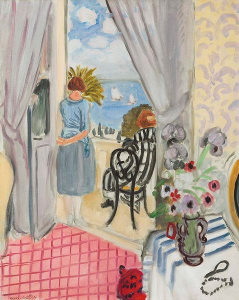 Curator: Welcome! Let's consider Henri Matisse’s 1924 painting, "Interior, Flowers and Parakeets". The work presents a seemingly straightforward domestic interior, rendered with the vibrant colors and flattened perspective characteristic of his Fauvist style. Editor: It's instantly calming, wouldn't you say? The colors, though intense, feel harmonious. There’s almost a theatrical sense of depth created by all the textiles, yet the forms themselves remain quite grounded. The eye is drawn to all of this vibrant decoration, and one wonders what the material sourcing looked like, and who profited. Curator: Indeed. Consider that Matisse created this work during a period of personal and societal transition. The aftermath of World War I deeply influenced artistic expression and ideas of domesticity. The parakeets—symbols often linked to exoticism, privilege and status–placed in the center, encourage contemplation about access and class, perhaps suggesting both comfort and constraint. Editor: It’s important to recognize the significance of the textiles here: the wallpapers, tablecloths, and carpets all bear designs hinting at far-flung origins. What sort of market system and global exchange of goods produced the interior presented in this painting? Curator: The patterns themselves create a dense visual field, evoking a sense of layered identity. The Fauvist movement encouraged exploring radical individualism and the bold liberation from traditional norms and color. It encourages thinking beyond Eurocentric constraints by blending oriental and domestic elements, creating a rich, complex cultural tapestry. What do you make of his use of oils in capturing all these competing forms? Editor: Matisse employed oils to render the visual texture of the different material presences within the depicted scene, thereby highlighting not only the formal complexity of this composition, but its tangible dimension too. It raises questions of labor – both the artist’s labor in replicating the forms within this domestic setting, but the invisible laborers that produced these fabrics. Curator: Looking through an intersectional lens highlights how our understanding of interiority intertwines with historical narratives of social strata, ownership, artistic choices, and personal journeys. Editor: Right. By analyzing the materiality of “Interior, Flowers and Parakeets,” we can begin to understand labor as being inherently connected to the domestic space as represented through painting, consumption, and artistry.