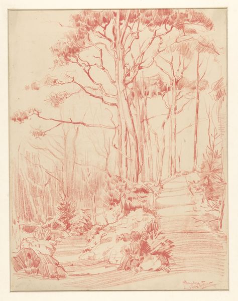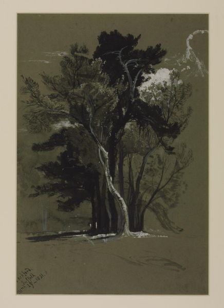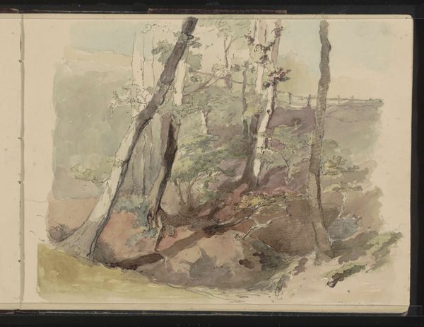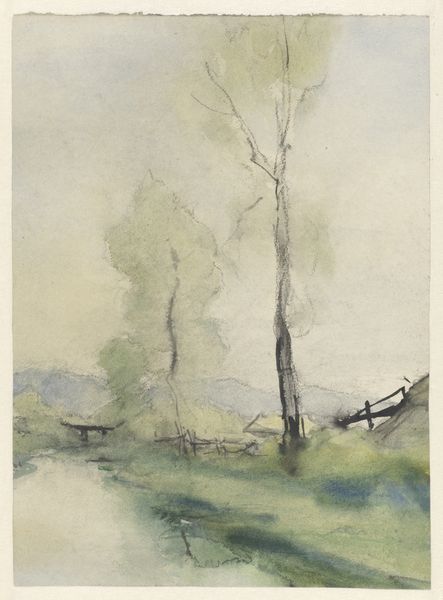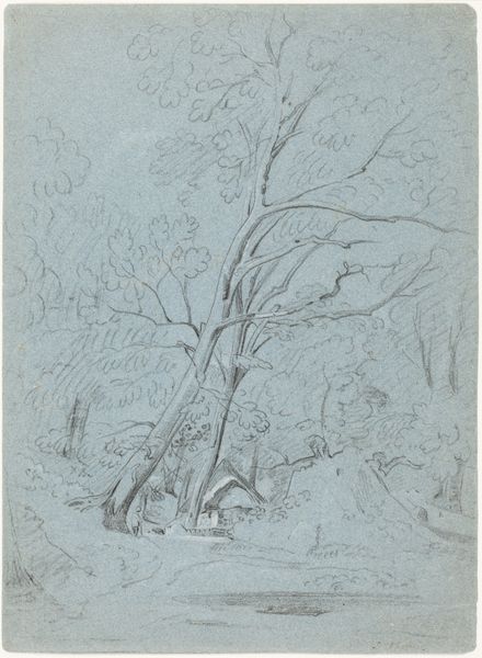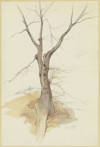 Curator: This watercolor and graphite drawing, entitled "Mountain Path with a Tree," was created sometime between 1825 and 1835 by the German artist Friedrich Nerly. Editor: It evokes such a sense of solitude and introspection. The stark, almost skeletal tree dominates the composition, and that muted palette really amplifies the melancholic atmosphere. Curator: Nerly, deeply rooted in the Romantic movement, often focused on landscape as a vehicle for expressing emotional states and spiritual ideas. Consider how the seemingly simple motif of a path embodies the journey of life. Editor: Precisely! Paths are a powerful universal symbol, frequently explored in literature and mythology, signifying choices and consequences. Notice how the tree acts as a sentinel guarding this path, it might be seen as representative of nature, time, and wisdom. Curator: And I believe Nerly created this en plein air; we understand he sought authentic encounters with nature, directly translating his observations and emotions onto the paper, infusing the image with spontaneity and immediacy. Editor: The scale, the slightly unsettling lack of defined figures… it makes me consider humanity’s place within the vastness of the natural world, emphasizing how delicate and impermanent it is. One could even link it to emerging anxieties about early industrialization and society's alienation from nature. Curator: Very insightful. He employs nature, as other Romantic artists like Caspar David Friedrich did, to reflect deep cultural and personal introspection, but also the sublime forces of a much bigger natural world beyond our comprehension. Editor: In essence, the tree isn’t just a tree, it’s a multi-layered vessel filled with meanings and symbolism. A very rich cultural history embedded in that deceptively simple landscape scene. Curator: Yes, a profound exploration achieved through remarkable skill. I come away reflecting on both our personal journeys and our societal trajectories through time, both ephemeral and lasting. Editor: Indeed, an invitation for us to contemplate the echoes of our cultural narrative that shape not just the world around us, but our place within it.