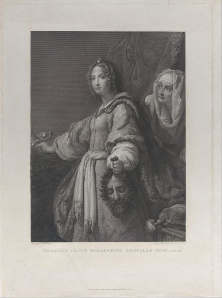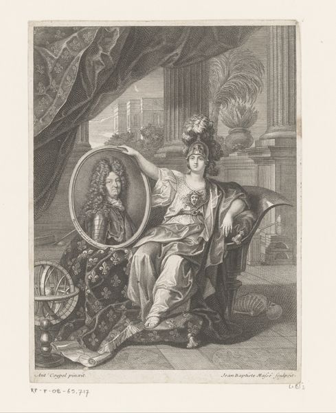 Curator: Here we have an engraving dating, quite broadly, from between 1694 and 1738, which means it exists within a timeframe dominated by Louis XIV and its immediate aftermath. Its creator is Michel Dossier. It's titled "Anne Varice de Vallière als Pomona." Editor: It strikes me as surprisingly domestic, given the theatrical title. A woman sits in what seems like a garden, rather passively. The overall tone is quite subdued, not what I'd immediately associate with Baroque. Curator: True, the composition contains both portrait and genre elements. The female figure is rendered as the Roman goddess Pomona, but within what seems to be an ordinary contemporary setting, suggesting a link between aristocratic life and mythological grandeur. This wasn't uncommon; allegory functioned to elevate the sitter. Editor: That’s fascinating! So, Madame de Vallière, perhaps a royal mistress? The garden and the aging, possibly lecherous-looking figure to the side–likely representing Vertumnus–feel symbolic of both luxury and vulnerability. Does the imagery suggest anything about courtly love and its inherent precarity? Curator: I think you are right to pinpoint that dichotomy; it speaks to the wider anxieties of status, reputation and appearance at the time. These portraits were, after all, intensely political objects which not only showcased one’s position but made a statement. Also, prints like these circulated widely, shaping public perception beyond the inner circle of the court. It speaks to how the monarchy tried to manage perceptions, offering ideals for a complex society to contemplate and, quite often, emulate. Editor: So much to consider from a seemingly simple engraving! I now appreciate how carefully constructed and potent these images could be in their day. Curator: Absolutely. The symbolic weight and societal purpose these engravings carried cannot be understated; Dossier's print offers a fascinating intersection of mythology, portraiture, and the dynamics of power during the late Baroque era.