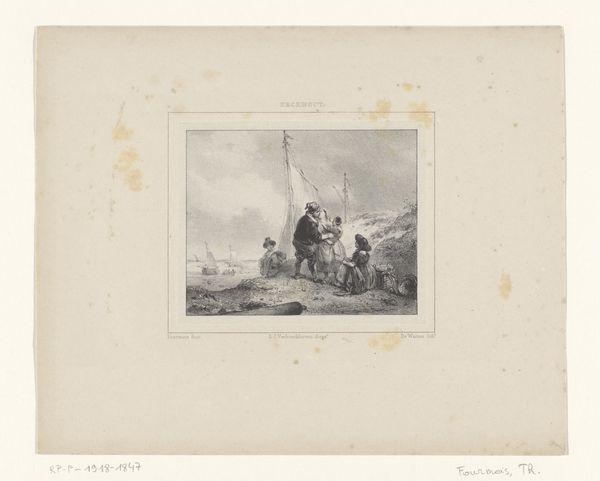 Curator: Johann Wölfle's "Man by a Fallen Hay Wagon in a Landscape," likely from the 1850s, captures a moment of apparent rural setback through the techniques of etching, drawing, and graphite on paper. Editor: My first thought? It’s heavy. The mass of the hay wagon and the weighty sky above really push down on that solitary figure. There’s a stillness and sense of waiting. Curator: Precisely, that stillness resonates when considering broader agricultural narratives. The accident potentially disrupts labor, bringing questions around agrarian hardship into sharp focus, especially in the mid-19th century, a period rife with anxieties concerning industrial encroachment and rural labor. Editor: I'm drawn to how the material – paper, graphite, and the etching process – contributes to this sense of weight. The textured shadows created by the etching build up the volume of the hay and even the clouds, making the toil palpable. We see evidence of labor at multiple stages. Curator: It also invites discussion about the representation of masculinity within such labor contexts. Consider the social roles thrust upon rural workers and what implications arise from unexpected delays in expected output and income. Editor: Absolutely. The horses standing nearby highlight animal labor, a power relationship often ignored. We see a dependency and disruption simultaneously: the wagon’s breakdown is theirs too, underlining their role within an economic ecosystem. Curator: The placement of the lone man in relation to the downed hay wagon invokes a feeling of powerless isolation. Does he consider an alternative future given his current predicament? Editor: The landscape seems both indifferent and implicitly part of this dynamic, doesn't it? Its passive participation in the economic cycle reinforces that connection of resources to markets. Curator: Indeed, reflecting on this scene urges one to rethink historical romanticism by weaving contemporary issues. How, even in stillness, the gears of material struggle still continue to shape the social dynamic. Editor: Seeing the artist's use of etching in combination with other materials brings the labor required for its creation into view. The act of observation can transform one's perceptions regarding materials, labor, and context.