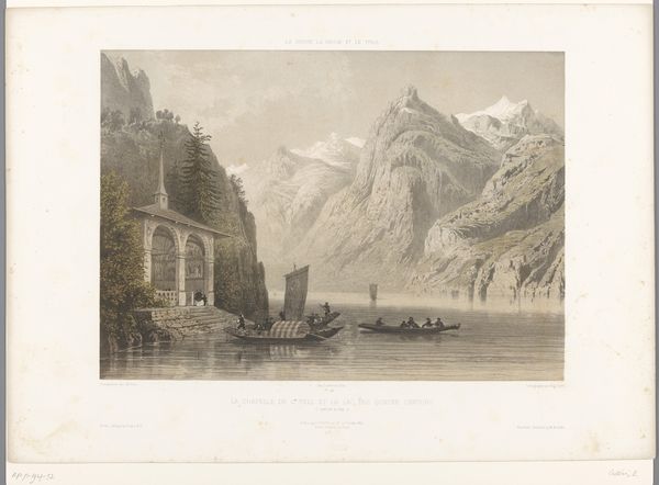 This is Rudolf Dikenmann’s photographic reproduction of a print of the Tellskapelle. Executed in monochromatic tones, the print presents a vista that balances architectural precision with the grandeur of the Swiss landscape. Note how the composition is structured into distinct horizontal layers: the detailed foreground with the chapel and boats, the expansive lake, and the towering, textured mountains in the background. Dikenmann uses a fine, almost stippled effect, to create a sense of depth and atmosphere. The orderly lines of the chapel contrast with the ruggedness of the natural forms, creating a visual dialogue between human construction and natural creation. Semiotically, the chapel may represent civilization and order, while the mountains stand for the sublime and untamed aspects of nature. Consider the delicate balance Dikenmann achieves between detail and scale, inviting reflection on humanity’s place within the larger, awe-inspiring world. This interplay reveals a thoughtful engagement with themes of nature, culture, and perception.