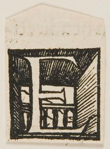 Editor: This is Ambrosius Holbein's "Letter P" from the Harvard Art Museums. It’s a small woodcut, and the density of the black ink makes it feel very powerful. What are your thoughts on it? Curator: I see how the artist uses the woodcut to construct the letter form and stage a dialogue between power and knowledge in 16th century European society. Do you notice how the landscape seems to be tamed, almost dominated by the letter? Editor: I see what you mean; it’s like the letter is asserting its dominance over nature. The composition suggests a hierarchy. Curator: Exactly! The image subtly reinforces the power structures of the time, where literacy and knowledge were tools of control, defining who held power and who did not. Editor: So much to unpack from such a small image! Curator: Indeed. It's a potent reminder of how art can reflect and reinforce social dynamics.