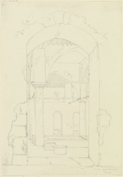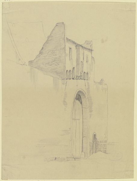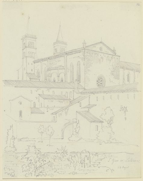 Curator: This drawing is by Friedrich Maximilian Hessemer. It depicts the Basilica di San Giovanni in Laterano, Rome, and it's dated 1828. Editor: There’s a simple charm to this pencil and paper rendering, a quiet humbleness in the sketch-like quality. The basilica looms in the background, viewed through an archway. It almost feels like an unfinished idea, which somehow makes it more appealing. Curator: Hessemer was heavily influenced by neoclassicism. Here, he’s showcasing the grandeur of the architecture. The archway frames the basilica, focusing our attention on its symmetrical design and imposing scale within Rome’s urban fabric. This wasn’t just a drawing; it was a statement about the cultural significance of the Church within 19th century society. Editor: The materials themselves contribute to that statement. Pencil on paper… It’s a very direct medium, showcasing the labor and hand of the artist in a tangible way. We can almost see the marks he made, the pressure of the pencil as he built up the forms of the building, of its very construction, but one can also appreciate that this is a reproduction or rendition. It makes me wonder about Hessemer’s workshop practices or about his motivations when choosing these very materials. Curator: This basilica held enormous political weight as the seat of the Pope before the Vatican. Its appearance here reinforces the Catholic Church’s architectural dominance. Hessemer's choice to depict it from this framed perspective acts almost like a stage, a set piece meant to inspire reverence for the established order. Editor: Absolutely, that framing, though, also hints at access, control of vision. It almost speaks to the church and nobility maintaining control of what you see as the people, of the world, literally. Curator: I agree. And it captures a particular moment, too: Rome as it was then, undergoing constant changes. Hessemer's work freezes that urban evolution, gives the viewer an idealized cityscape amidst those societal shifts. Editor: Yes, through very modest means too. His attention to the means of production, to those architectural masses and their own manufacturing origins. Ultimately, this is about both idea and material. Curator: So it's more than just a picture; it's an index to a whole socio-political climate, embedded within architecture and artistic approach. Editor: Right, an exercise in visualizing both labor and belief.