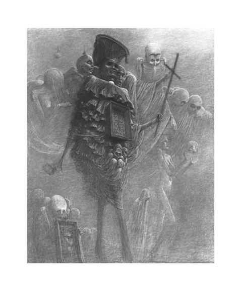 Editor: This ink and pencil drawing, "The Supreme Vice," created in 1883 by Felicien Rops, presents such a stark and unsettling image. The skeletal figures are quite macabre. What socio-political commentaries might Rops be making here? Curator: Rops was deeply critical of the bourgeoisie of his time. His art frequently explored themes of societal decay and moral corruption, especially how those played out around perceptions of women. What strikes you about the symbolism here? Editor: Well, the headless figure in the suit handing its head over to Death... it definitely speaks to themes of foolishness, a life squandered, or lack of intellect maybe? Curator: Exactly. Now consider where this work would have been displayed, likely within artistic circles that embraced this kind of dark satire and the societal critique. It challenged the prevailing norms. Think about how it used shock value to comment on class and mortality. Editor: It feels almost like a political cartoon, designed to provoke a reaction. Curator: Indeed. The allegorical nature of this piece and the use of loaded imagery speak volumes. The placement of the figures atop a base with “Roma” inscribed also evokes classical antiquity. Is Rops suggesting that modern societal failings were always there in the roots of Western civilization? What kind of commentary is being delivered here? Editor: I see that, I suppose the commentary is directed toward the decadence and vanity that are constants of civilisation. I see so many layers in it! It definitely gave me something to think about. Curator: Me too! It reminds us of the importance of examining art within the social structures from which it comes. These are the forces which determine who makes it, how it is interpreted, and what power it yields.