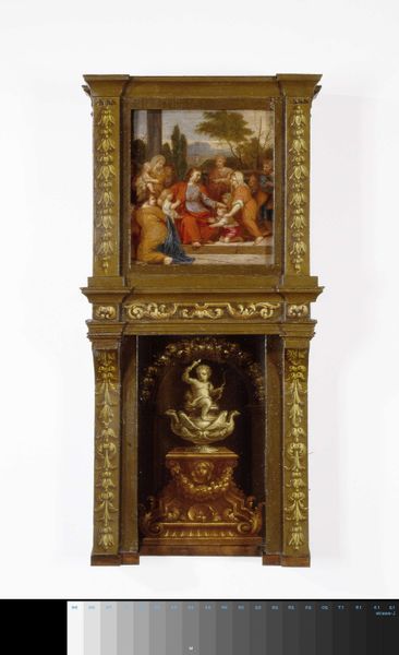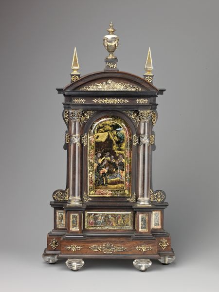 Editor: We're looking at Karl Ballenberger's "Saint Elizabeth of Thuringia Giving Alms," from 1833. It’s currently held at the Metropolitan Museum of Art. It's a small watercolour framed in carved wood. The subject is sweet but almost saccharine. What can you tell me about its deeper meaning? Curator: Consider the imagery presented. St. Elizabeth, hands outstretched, occupies a liminal space between security and exposure, offering alms. What do you think this positioning suggests about the nature of charity in the early 19th century? Editor: It makes her accessible but also vulnerable. Almost theatrical, but also staged, and that feels... romantic. Curator: Indeed! Romanticism loved the medieval. Ballenberger is deliberately evoking that era to explore contemporary social concerns. The choice to depict almsgiving harkens back to a perceived "golden age" of social responsibility, a time, as idealized, when the wealthy took care of the poor as a matter of course. Notice how the architectural framework of the image mimics Gothic arches. Editor: It's like he's using historical symbols to comment on the present? Curator: Precisely! The artist relies on potent visual and cultural symbols associated with compassion, like Saint Elizabeth herself, to question his own era's commitment to similar ideals, prompting viewers to consider how society has changed. How potent that the choice of watercolour also has its own associated meanings and histories! Editor: So the act of giving alms, presented in a carefully constructed historical setting, carries a message that is really about *then*, but about the responsibility of the wealthy in *our* own time? That is amazing, it carries a moral weight in the display of sympathy! Thank you! Curator: Indeed. By examining art through its symbolic language, we can understand not just what the artist saw, but what they hoped the world could become.