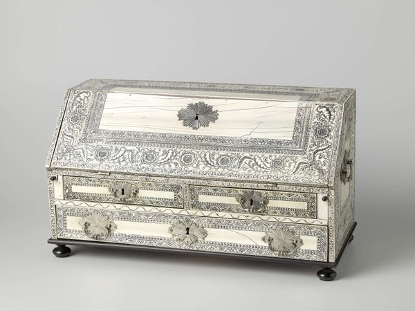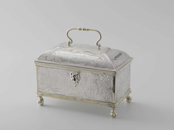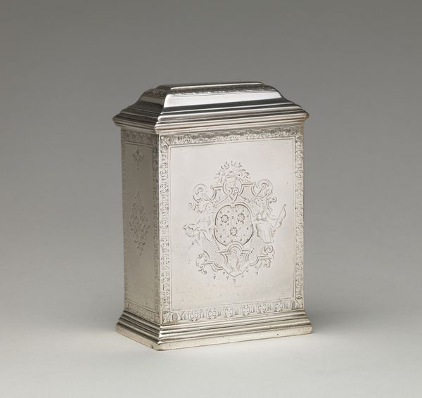 Curator: This exquisitely crafted object before us is a silver casket, dating from 1716 to 1717, attributed to James Fraillon. Editor: My immediate impression is of a rather formal piece. Its cubic structure and regimented embellishments evoke restraint, don't you think? Curator: Indeed. Note the composition, how the surface is articulated. The rectangular form establishes a structured base upon which the refined silver ornamentation unfolds, exhibiting a visual vocabulary rooted in classical ideals of order and proportion. Editor: But what of the labor required? Think of the silversmith meticulously hammering, engraving, each curve and line driven by physical effort. Its high material worth certainly spoke to its patron's financial and social standing. Who commissioned this object, and what purpose did it serve in their daily life? Curator: Those are valid points. If we delve into its symbolic value, we notice an engraved crest. It presents itself front and center on the box top, suggesting aristocratic ownership. A further investigation into this object's past could yield answers on who crafted this piece, which would give a more profound view on period manufacturing in the area. Editor: Absolutely, let's not disregard the socioeconomic realities behind it! The raw material, the workshop, the craftsman’s skill all are reflective of material exchange of 18th-century luxury markets and modes of artistic production. Curator: Precisely! The convergence of material presence and historical moment— the social conditions inherent in art itself, a complex, symbiotic interaction that requires us to engage multiple analytical approaches. Editor: The beauty lies indeed in this interaction, this connection and in thinking beyond just admiring its formal qualities!